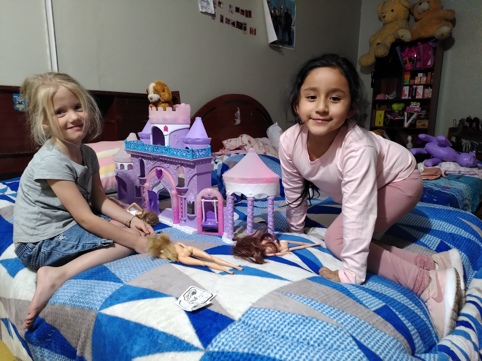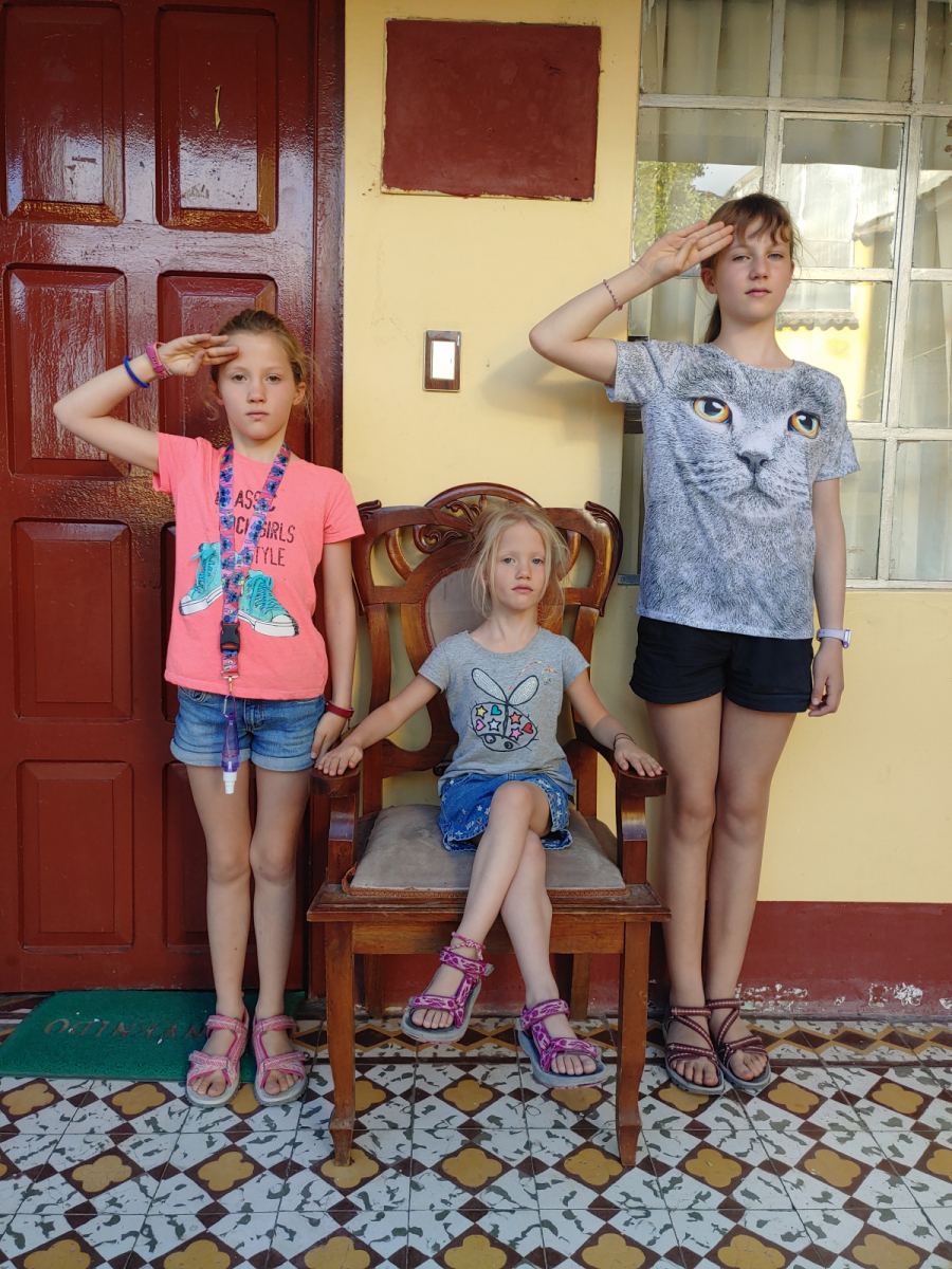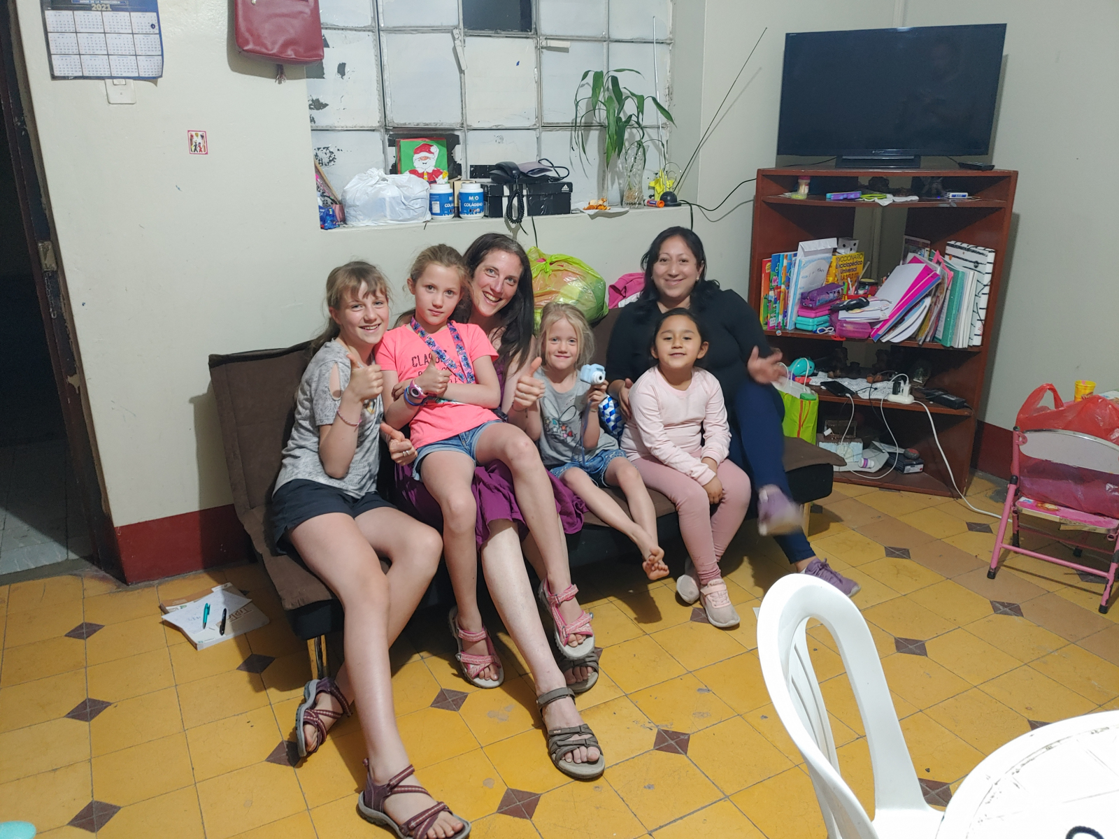 Nous avons beaucoup aimé loger à cet endroit, côtoyer un petit bout de Pérou authentique et faire la connaissance de personnes extrêmement chaleureuses. La famille qui habitait au rez-de-chaussée au bout de la cour se composait d’une maman, Violeta, une petite fille, Maia (5,5 ans) et une grand-mère. Il y avait peut-être aussi un papa, mais nous ne l’avons jamais vu. Elles vivaient toutes les trois dans une seule pièce faisant environ 7m sur 3,5m, soit moins de 25m². Dans la pièce, il y avait un canapé, une table de jardin, des chaises en plastique blanc et plus loin deux lits doubles côte à côte. Il y avait aussi quelques étagères et beaucoup de jouets, au grand plaisir de Margaux. Violeta était super accueillante. J’ai beaucoup aimé discuter avec elle pendant que Margaux et Maia jouaient ensemble sur un des lits.