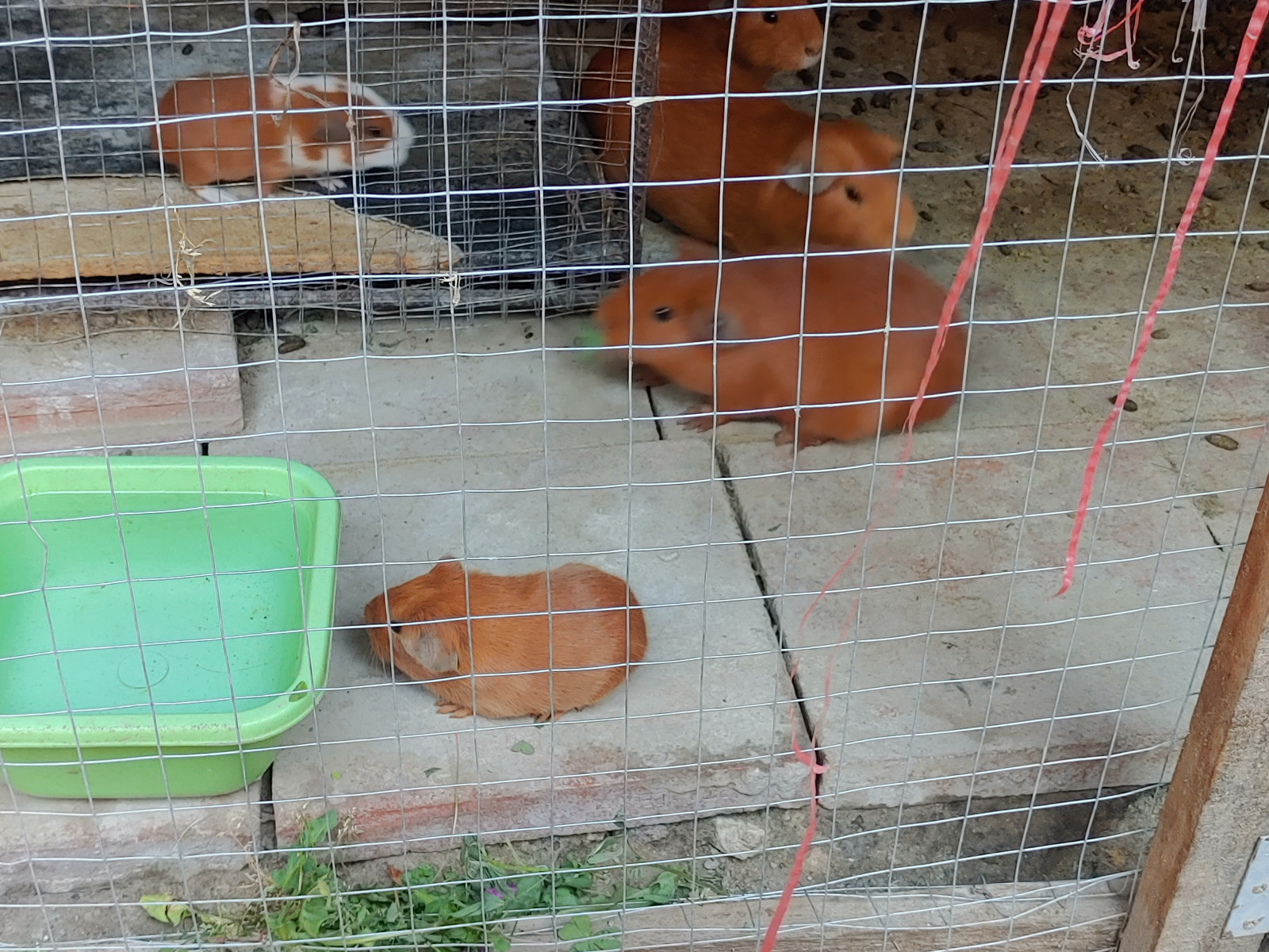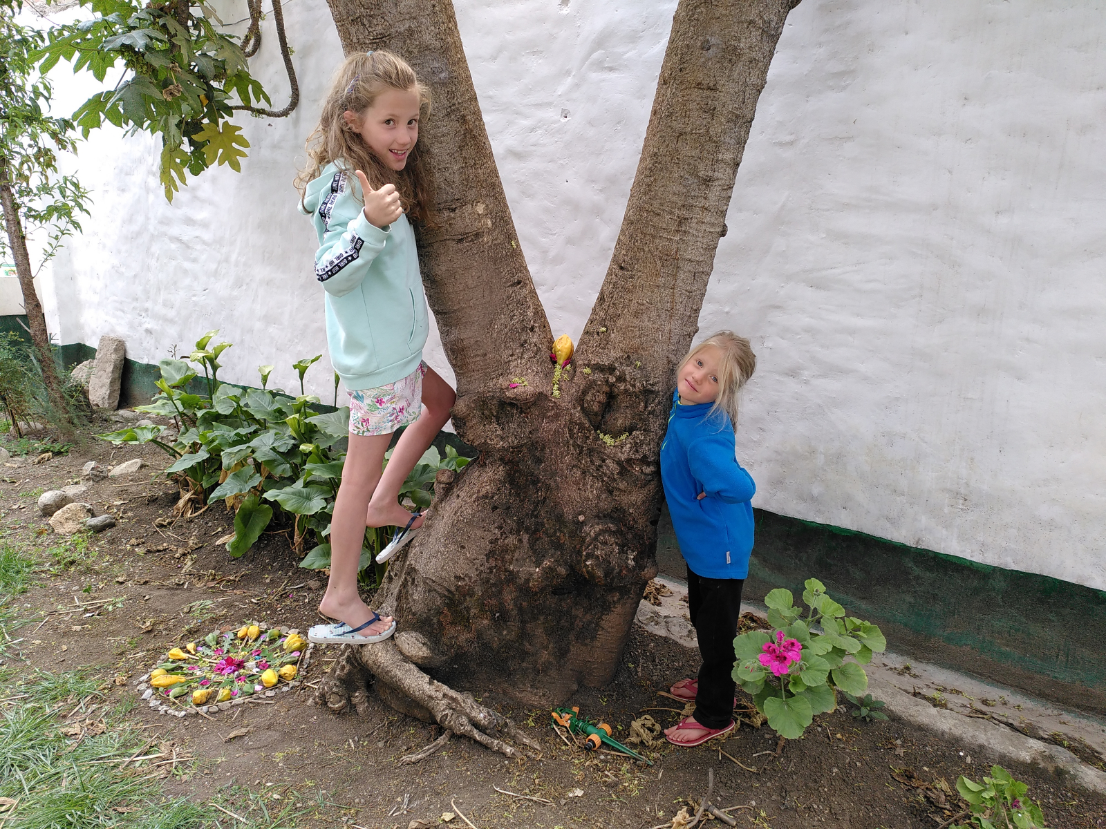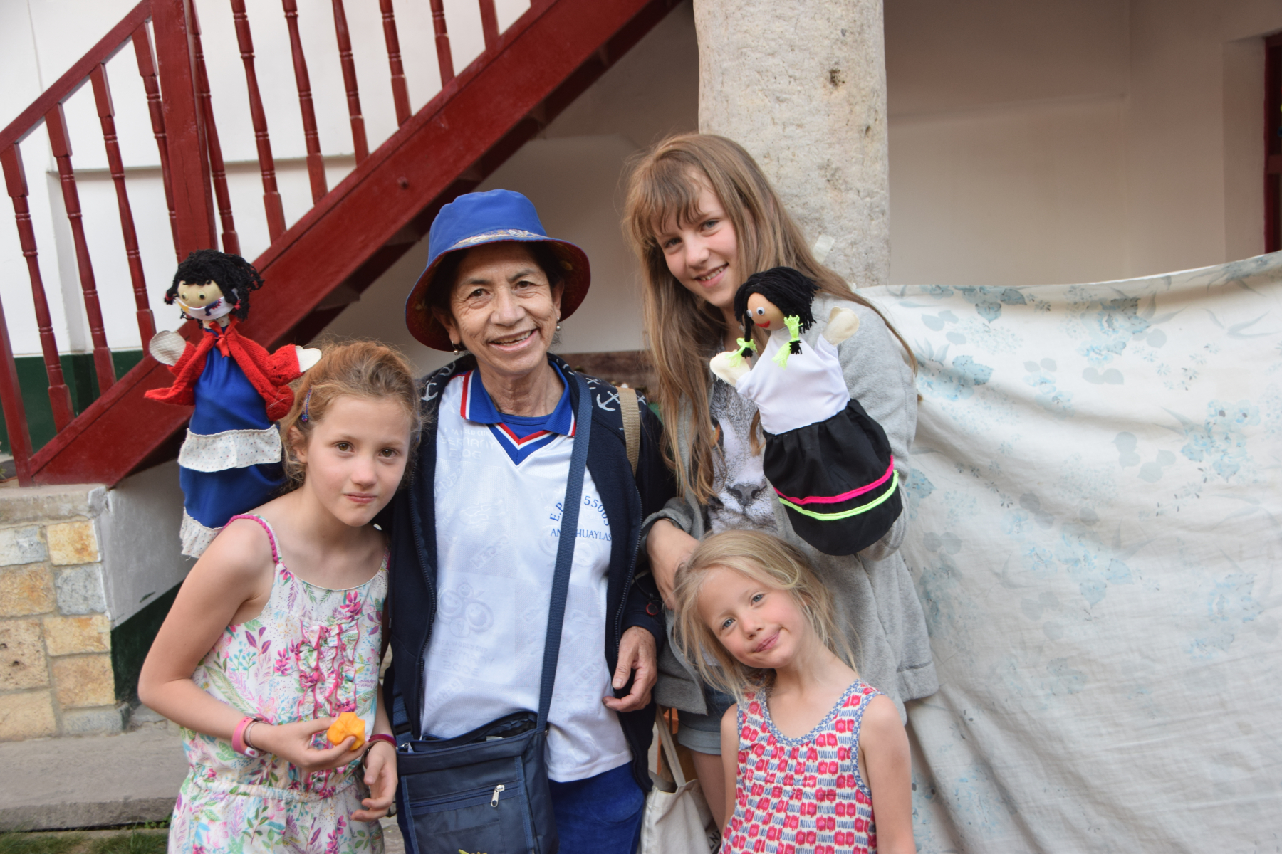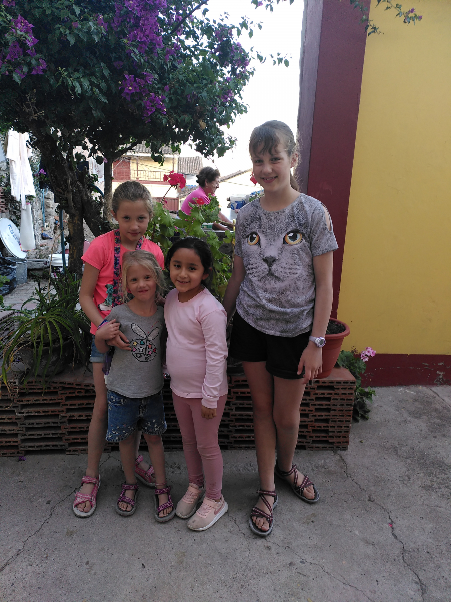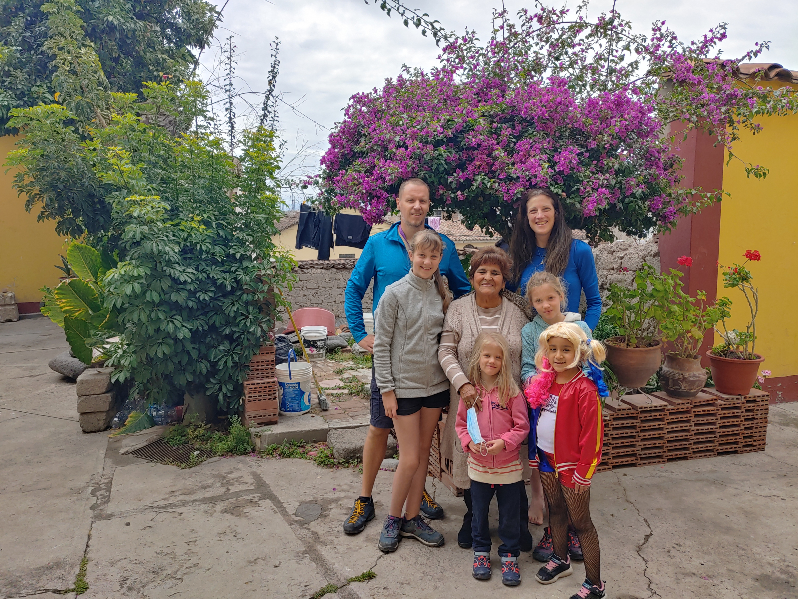 Comme beaucoup d’autres péruviens, la propriétaire de l’hospedaje était complètement sous le charme des cheveux blonds et des yeux clairs de nos filles. Elle ne nous croisait jamais sans dire : « Ai que lindas! Hermosas! Se parecen como muñequitas! » (Ah qu’elles sont jolies ! Qu’elles sont belles ! On dirait des poupées !) Elle habitait, avec au moins un de ses fils, une aile du bâtiment perpendiculaire à celle des chambres. Juste en face de nos deux chambres, il y avait un très joli mini jardinet avec un grand évier où elle et les autres résidentes faisaient leur vaisselle et leur lessive. Il y avait aussi, au plus grand bonheur de nos filles, une grande cage avec des cuys (des chochons d’Inde).