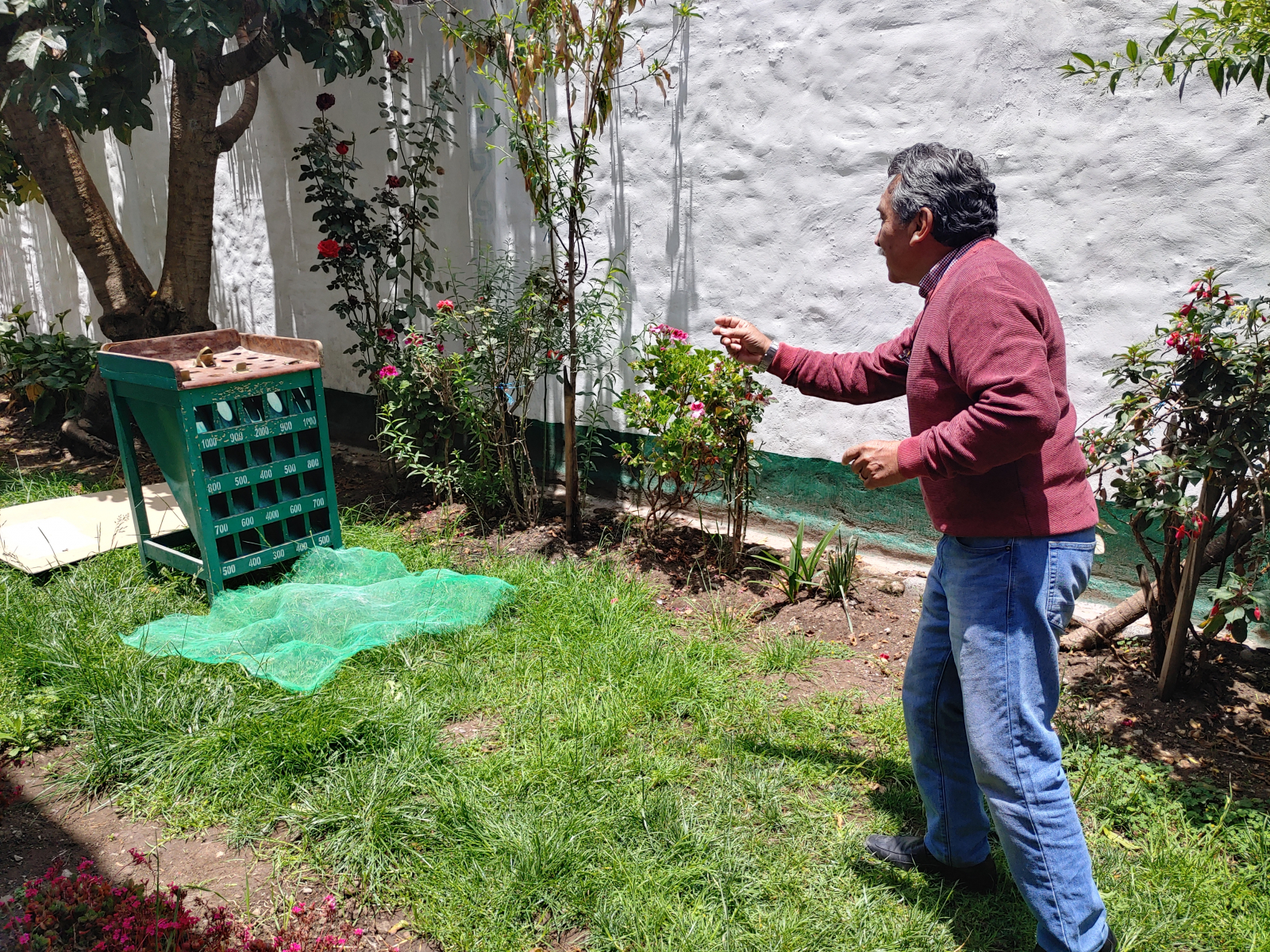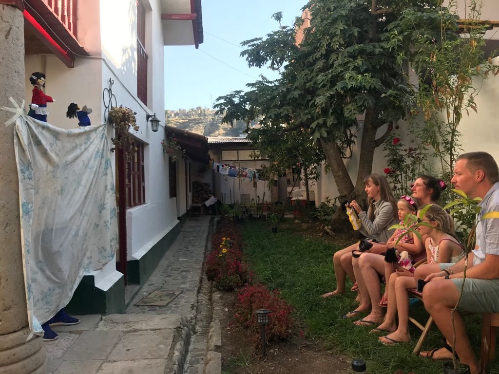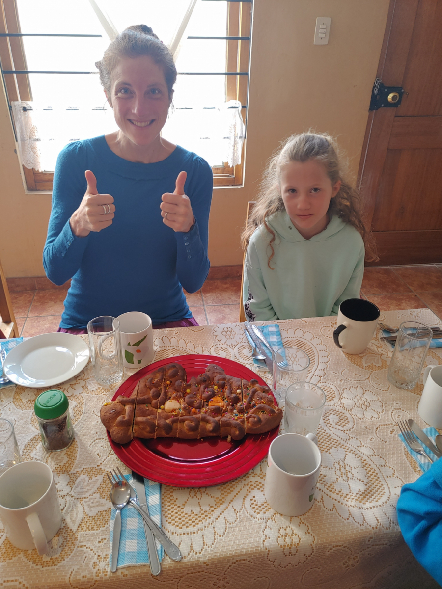 Nous louons chez eux une petite maison qui se trouve dans leur jardin, à l’intérieur du pâté de maisons. C’est comme une oasis, un havre de paix en pleine ville. Nous avons trois chambres avec chacune une salle de bain, une petite cuisine et un jardin ! Quel plaisir de cuisiner nos propres repas ! De profiter du jardin, de manger dehors, de se reposer. Dès le lendemain de notre arrivée, Elena et Carlos nous ont invités au petit déjeuner chez eux avec leur famille. C’était le 1er novembre, la fête du Wawa. Wawa veut dire bébé en quechua. Lors de cette fête, la famille se rassemble pour le petit déjeuner. On mange du cochon de lait et des wawa, des pains qui ressemblent très fort à des cougnous, décorés de sucreries. Pour les femmes, il y a des wawa en forme de bébés et pour les hommes en forme de chevaux. Après le petit déjeuner, on a discuté et joué au jeu du sapo (du crapaud) dans le jardin. C’est un très chouette jeu auquel on avait déjà joué à Apu Ecolodge à Caraz et qu’on s’est promis d’acheter pour chez nous en Belgique.