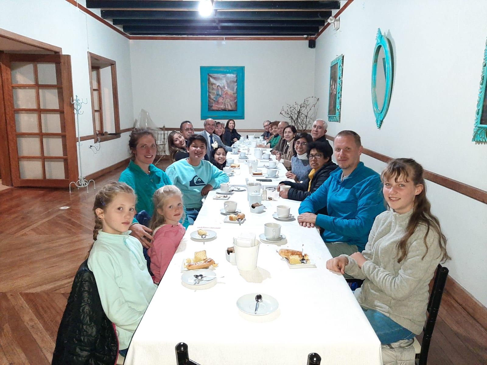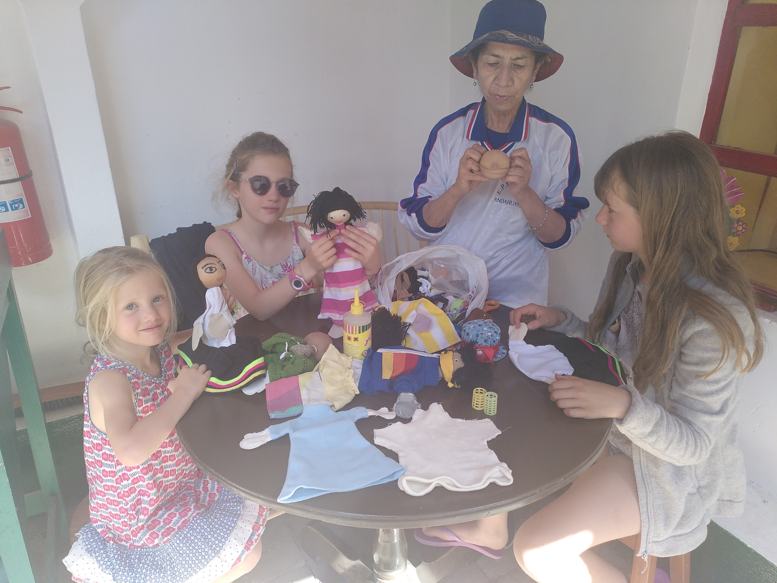 Hier après-midi, la sœur de Carlos, Vicky, est venue montrer aux filles comment fabriquer une marionnette. Elle est enseignante et adore les enfants. Le soir, Elena et Carlos nous ont invités à rejoindre la famille élargie dans un magnifique restaurant sur la Plaza de Armas pour un lonche, l’équivalent du goûter chez nous, à la mémoire du papa de Carlos. On a goûté pour la première fois du ponche de almendras, une boisson chaude à base d’amandes dans laquelle on rajoute du pisco, une eau-de-vie de vin. Succulent ! Le ponche était accompagné d’une roulade au fromage et de gâteau.