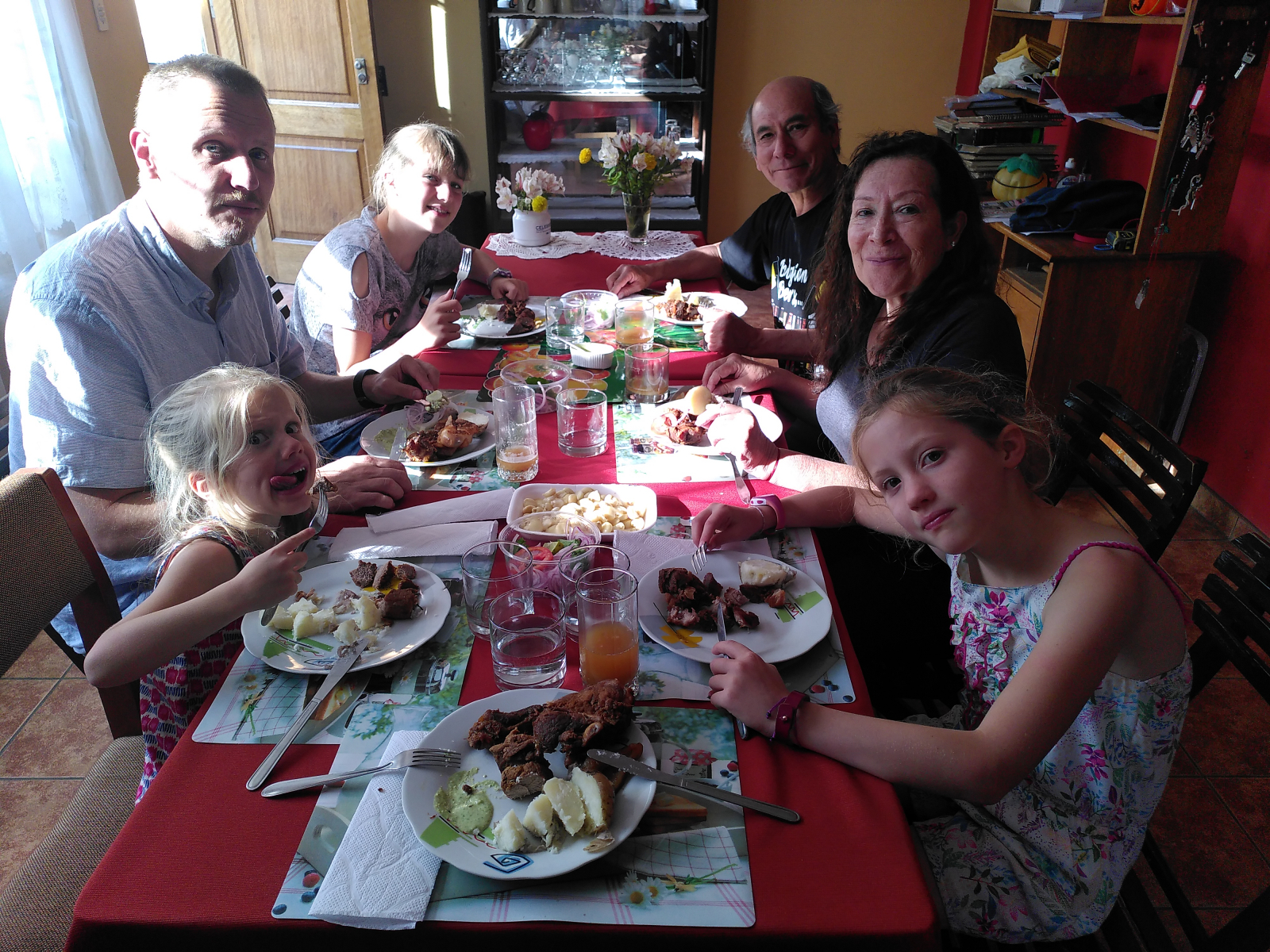 Hier après-midi, la sœur de Carlos, Vicky, est venue montrer aux filles comment fabriquer une marionnette. Elle est enseignante et adore les enfants. Le soir, Elena et Carlos nous ont invités à rejoindre la famille élargie dans un magnifique restaurant sur la Plaza de Armas pour un lonche, l’équivalent du goûter chez nous, à la mémoire du papa de Carlos. On a goûté pour la première fois du ponche de almendras, une boisson chaude à base d’amandes dans laquelle on rajoute du pisco, une eau-de-vie de vin. Succulent ! Le ponche était accompagné d’une roulade au fromage et de gâteau.