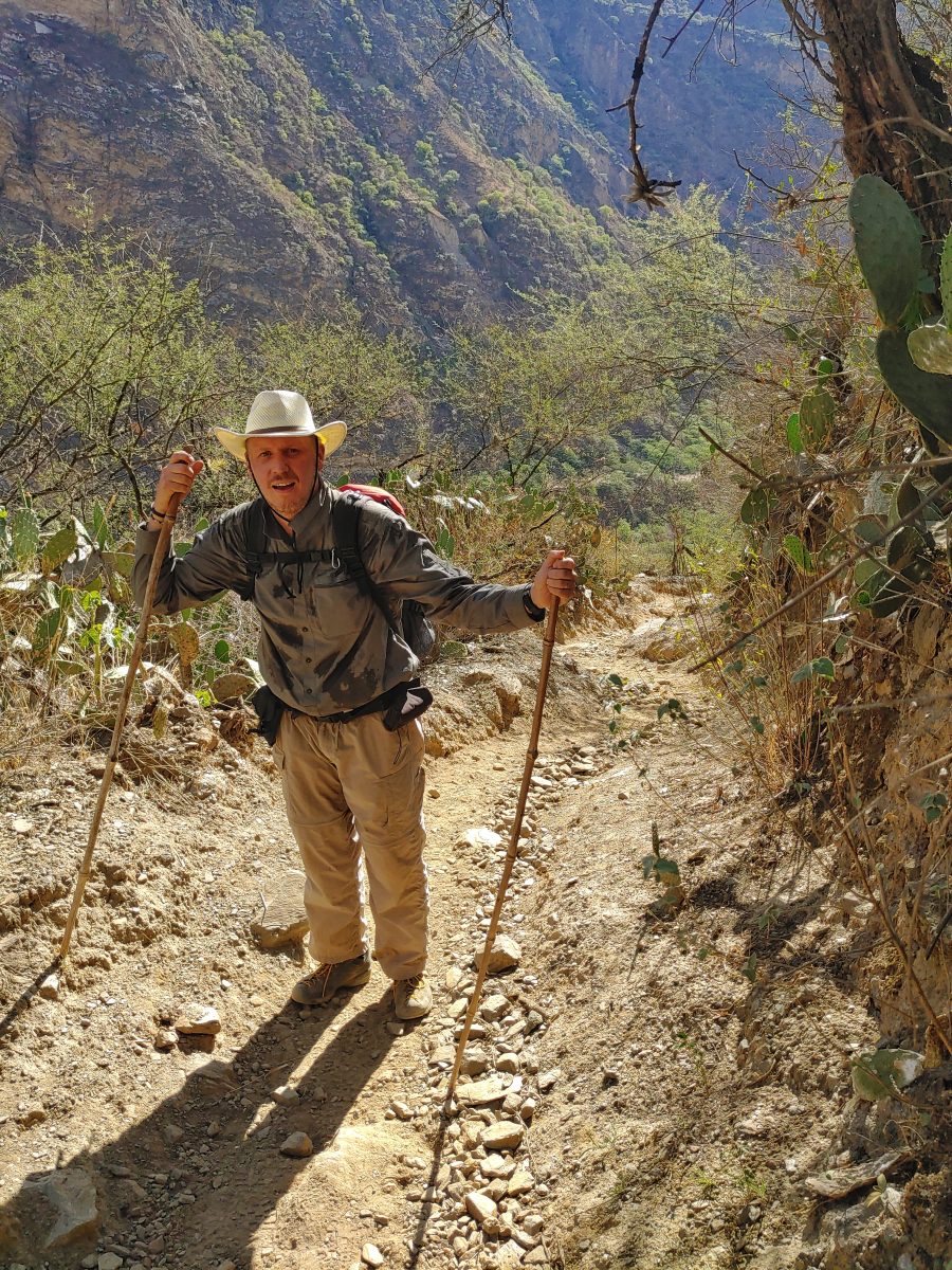 Nous n’avions – évidemment – pas pris beaucoup d’affaires avec nous. La majorité de nos bagages est restée à Capuliyoc, le petit paradis terrestre perché sur son éperon rocheux. Chacun(e) avait deux t-shirts à longues manches, un seul pantalon, trois paires de chaussettes et trois sous-vêtements. On faisait une petite lessive chaque après-midi, quand on arrivait à l’endroit où on dormait le soir. Les vêtements séchaient assez vite dans le vent et la chaleur. C’était facile. Nous portions dans nos sacs à dos l’eau pour la journée et des en-cas. Les deux mules porteuses se chargeaient du reste.