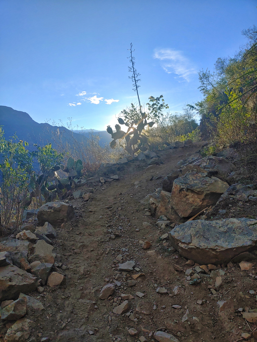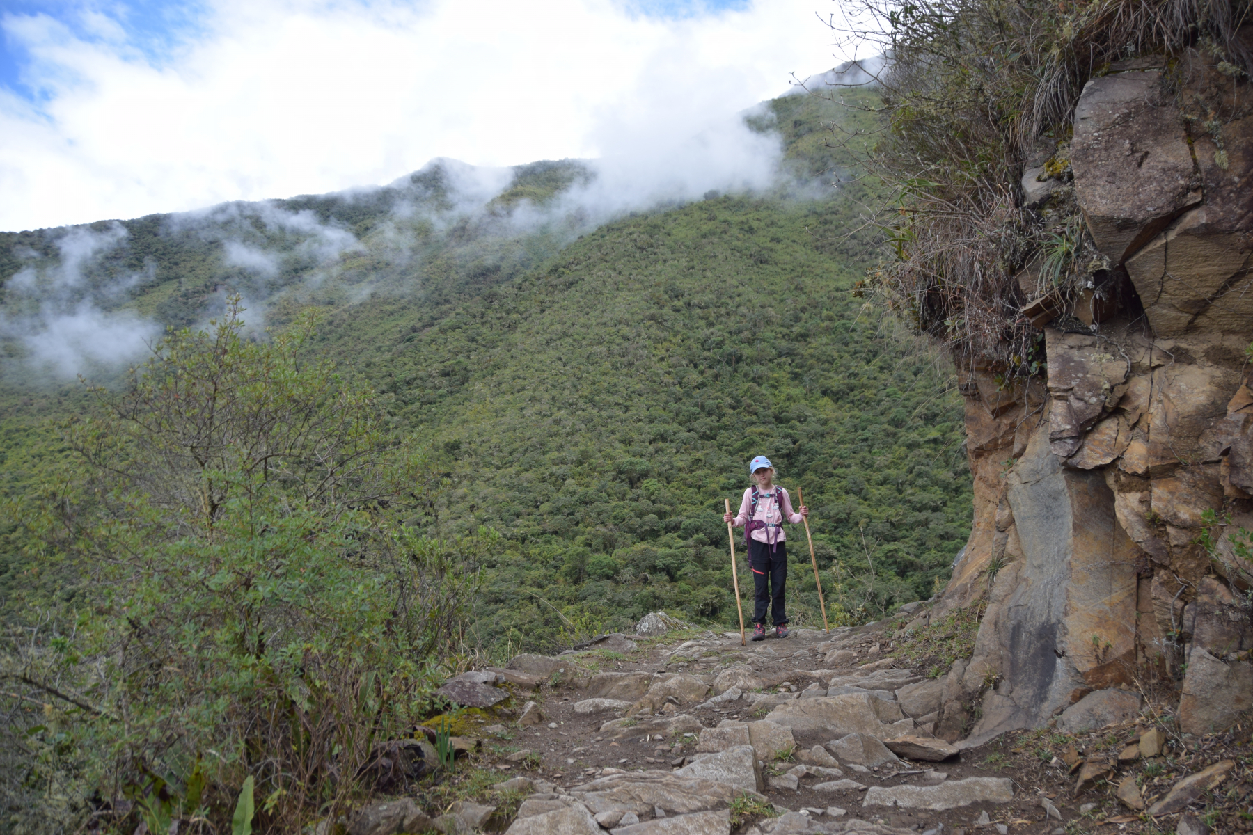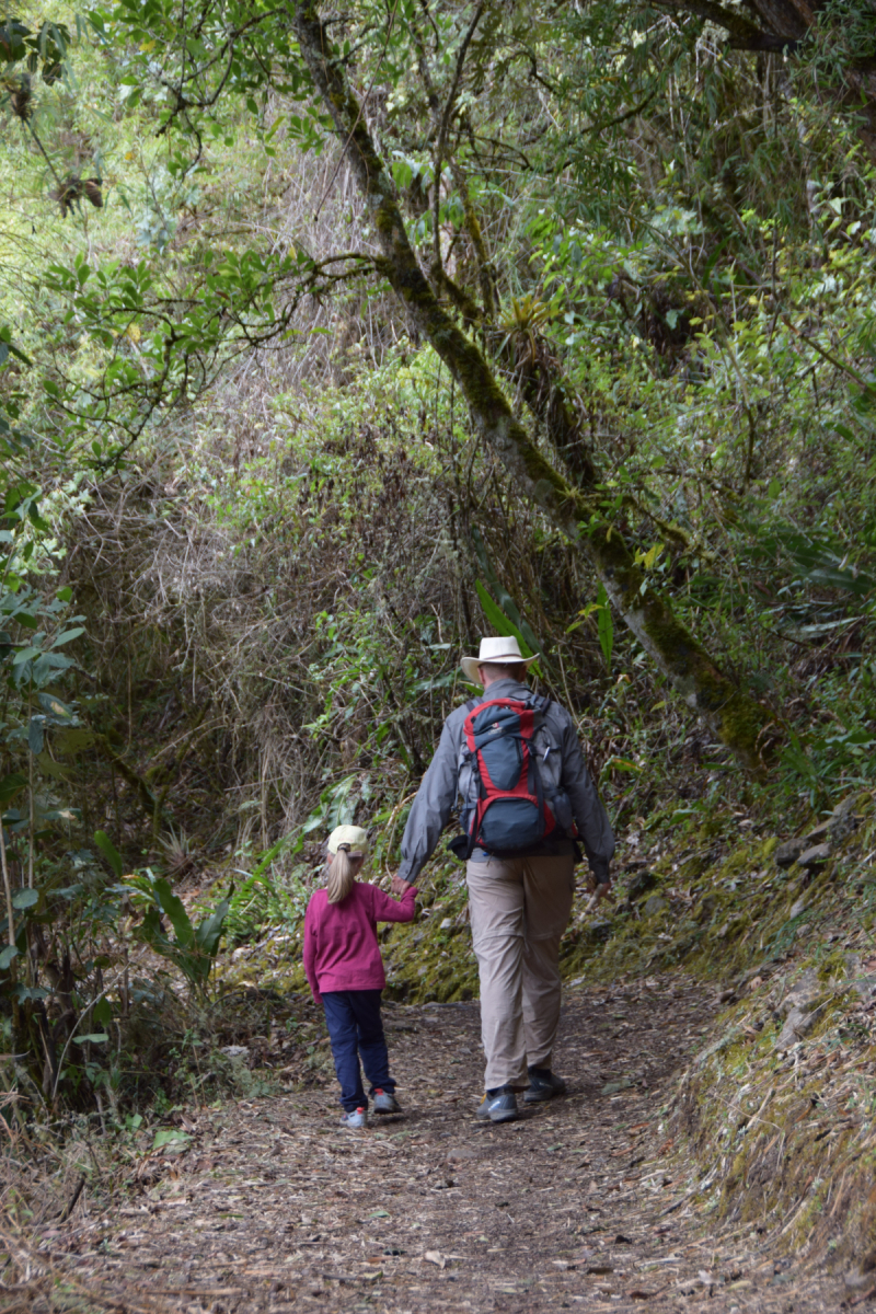 Je reviens encore une fois avec cette #?§!!# de rude montée vers Santa Rosa. Quand j’ai commencé à récupérer mon souffle et mon courage, Nico a entendu appeler. « C’est une des filles ? » Je n’entendais rien. Quelques minutes plus tard, je l’ai entendue aussi, une petite voix légèrement paniquée : « Maman ! Papa ! Vous êtes où ? » C’était Éline. « On est là ! On arrive ! » Nico est parti devant. Il a vite rejoint Éline, qui était en train de descendre à pied vers nous. Elle avait demandé à descendre de sa mule, car elle avait trop mal au dos. Elle avait continué à monter un peu, mais ne nous voyant pas arriver, seule sur le chemin, elle a pris peur et elle est descendue à notre rencontre. Ma pauvre choupinette ! À son âge, j’aurais eu super peur ! Nous avons continué la montée ensemble et quelques minutes plus tard, dans une épingle à cheveux, nous avons croisé le chemin d’un coureur de trail (= de la course en montagne) toulousain qui nous a dit : « Vous êtes français ? » On a discuté quelques minutes avec lui. Il nous a dit que cette montée était l’une des plus dures qu’il n’ait jamais faite. Cette phrase, qu’est-ce qu’elle m’a fait du bien ! J’étais déjà en train de me dire que je n’avais plus 20 ans, que je n’étais plus assez sportive dans ma vie quotidienne, que, rien à faire, il fallait bien admettre que ce n’était plus de mon âge. Mais en fait si ! Même ce monsieur qui fait du trail était en train de me dire que c’était une montée mortelle. Ça m’a donné plein de courage pour la suite du trek. Avant de nous quitter, il nous a donné un petit tube de pâte sucrée énergisante à nous partager. Je lui serai éternellement reconnaissante de s’être arrêté pour nous parler et nous remonter le moral et l’énergie.