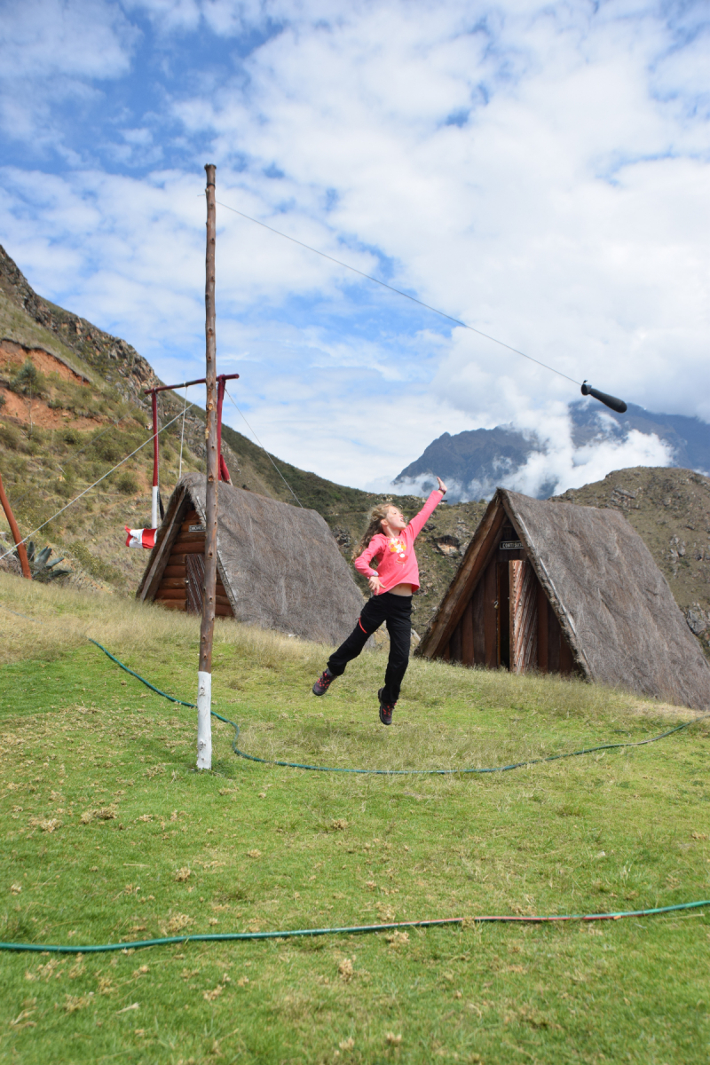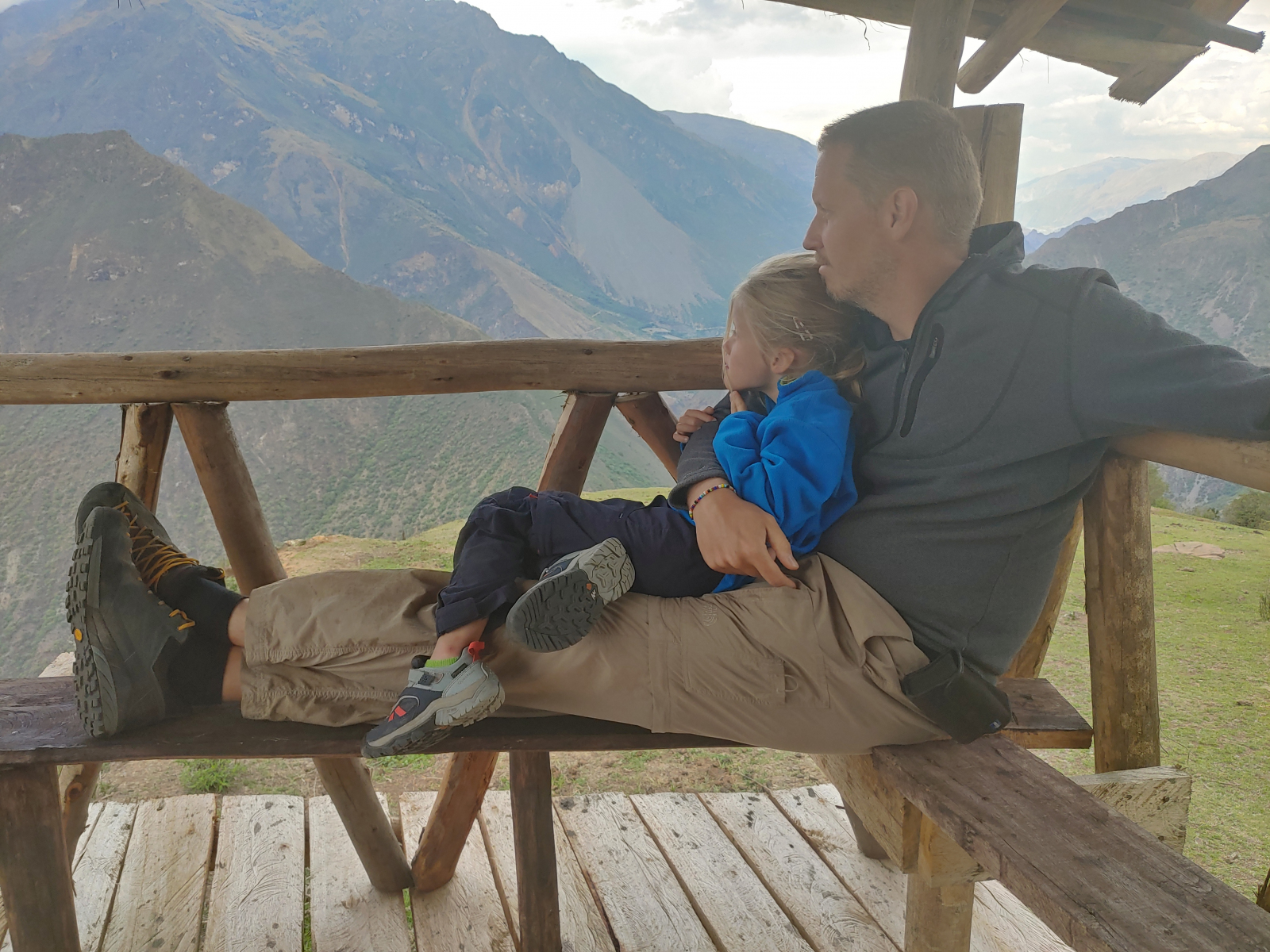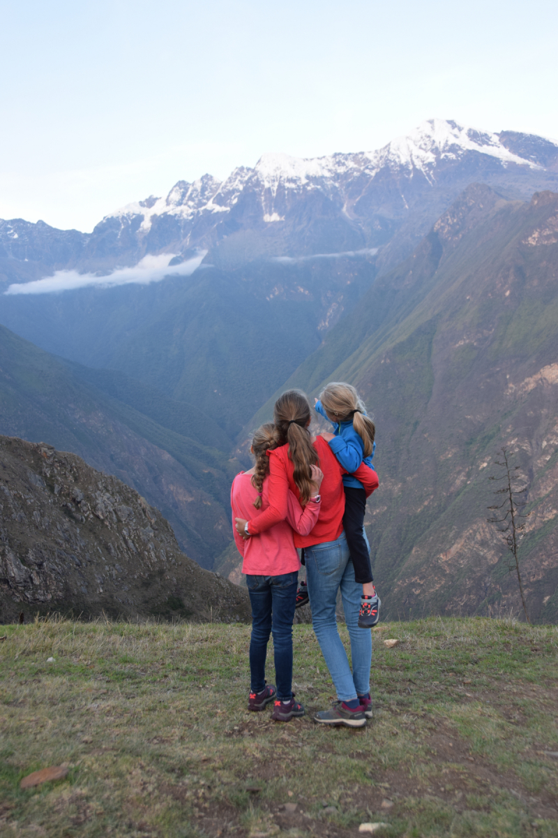 Ça, c’est un peu l’histoire de ma vie. C’est quelque chose dont je tire un immense plaisir : ce sentiment de « ça y est, je l’ai fait ! » et le repos qui suit. Chaque soir, quelle joie d’être toute fraîche après ma douche. Physiquement très fatiguée mais moralement au top. Quel plaisir d’aller dormir et de laisser se reposer mon corps. Et à la toute fin du trek, à l’arrivée au col avant Capuliyoc, explosion de joie : « On l’a fait ! On l’a fait ! On l’a fait ! » (et on est tous vivants et entiers) Quel plaisir de se réinstaller pour une après-midi et une nuit dans ce petit paradis perché, de se reposer dans les chaises longues, de boire une boisson fraîche, d’admirer le paysage, avec cette sensation intense et cette fierté de « On l’a fait ! » Fière de moi, mais aussi et surtout de Nico, de nos trois louloutes, de nous en tant que famille. Fière d’Éline qui a dépassé sa peur de monter sur un équidé, qui est arrivée à dépasser sa douleur, à tenir bon, jusqu’au bout. Fière de Lucie, à l’aise comme un poisson dans l’eau et heureuse comme tout sur sa mule, qu’elle dirigeait toute seule. Fière de Margaux, qui a marché avec une énergie incroyable les trois heures de marche en montées et descentes vers le site de Choquequirao le 3e jour.