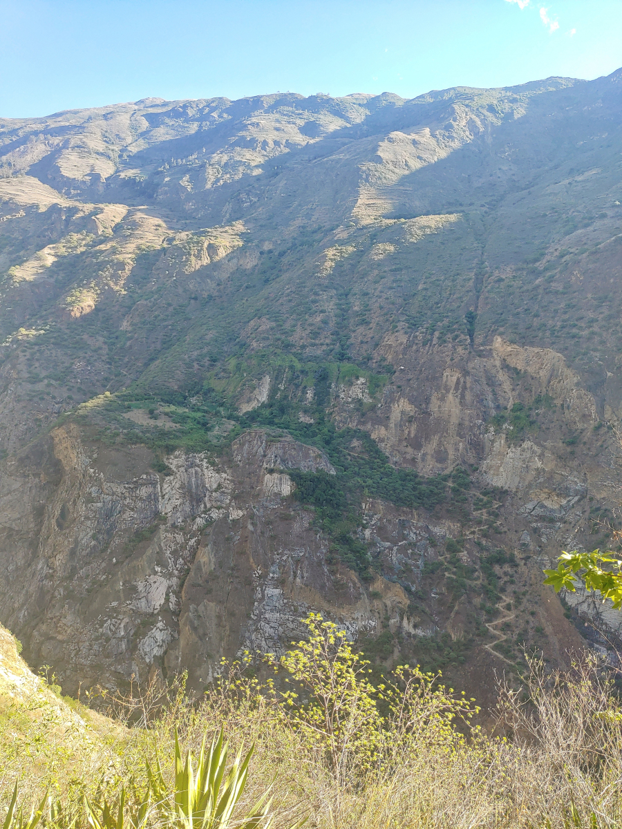 Les 500 mètres de dénivelé positif vers Santa Rosa, l’endroit où nous avons dormi la première nuit, fut pour moi une épreuve d’endurance, de persévérance et de confiance. Depuis Capuliyoc, l’endroit du début du trek, jusqu’à la rivière Apurimac, le point le plus bas ce jour-là, nous avions déjà descendu 1500 mètres de dénivelé. Nous avions mangé le repas de midi à Chiquisca, un petit ensemble de maisons avec épicerie et lodge, presque à la fin de la descente. Nous avons traversé le pont au-dessus de la rivière Apurimac peu avant 15h, puis nous avons entamé la montée en lacets sur l’autre versant, vers Santa Rosa. Dans la descente, nous étions restés groupés avec les mules qui portaient les enfants et celles qui portaient les bagages. Au début de la montée par contre, Nico et moi nous nous sommes vite rendu compte qu’elles marchent beaucoup plus vite en montée qu’en descente. Nous avons d’abord essayé de les suivre pour rester avec les enfants et nos guides, Romulo et son fils Jhoel (10 ans). Très mauvaise idée ! Nous avons entamé la montée à un rythme bien supérieur au nôtre. Le temps de nous en rendre compte, nous étions très essoufflés. Le soleil tapant de l’après-midi ne nous aidait pas. Le chemin montait en interminables lacets sur un versant quasi à la verticale. Nous avions beau nous arrêter et faire des pauses, je n’arrivais pas à récupérer mon souffle ni un rythme cardiaque satisfaisant. Une petite blague un peu mal tombée de Nico a fini de m’achever : « Dis, Steph, ne me refais pas une embolie pulmonaire hein ! En plus on n’a pas pris les injections de clexane avec nous. »