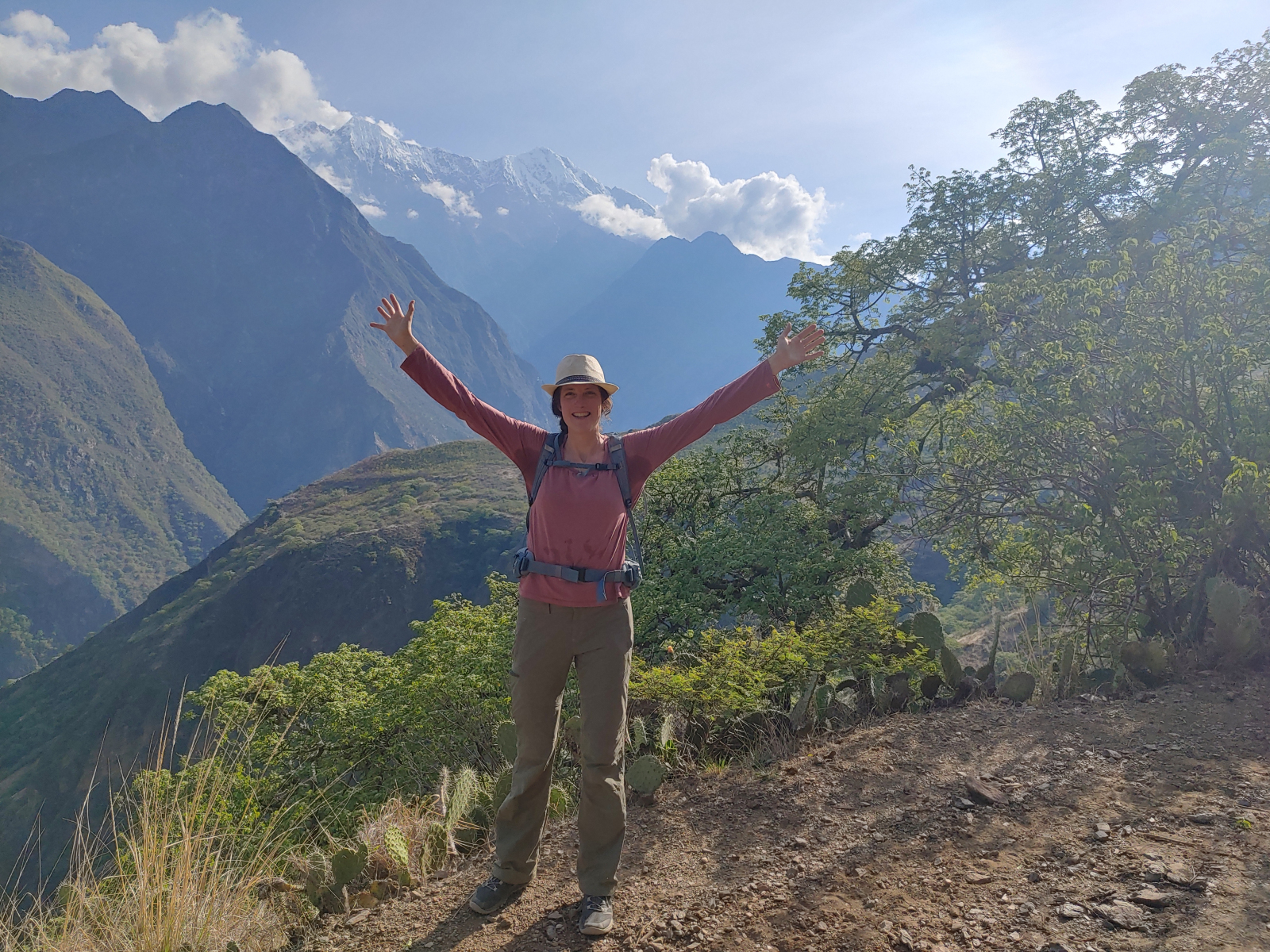Ça, c’est un peu l’histoire de ma vie. C’est quelque chose dont je tire un immense plaisir : ce sentiment de « ça y est, je l’ai fait ! » et le repos qui suit. Chaque soir, quelle joie d’être toute fraîche après ma douche. Physiquement très fatiguée mais moralement au top. Quel plaisir d’aller dormir et de laisser se reposer mon corps. Et à la toute fin du trek, à l’arrivée au col avant Capuliyoc, explosion de joie : « On l’a fait ! On l’a fait ! On l’a fait ! » (et on est tous vivants et entiers) Quel plaisir de se réinstaller pour une après-midi et une nuit dans ce petit paradis perché, de se reposer dans les chaises longues, de boire une boisson fraîche, d’admirer le paysage, avec cette sensation intense et cette fierté de « On l’a fait ! » Fière de moi, mais aussi et surtout de Nico, de nos trois louloutes, de nous en tant que famille. Fière d’Éline qui a dépassé sa peur de monter sur un équidé, qui est arrivée à dépasser sa douleur, à tenir bon, jusqu’au bout. Fière de Lucie, à l’aise comme un poisson dans l’eau et heureuse comme tout sur sa mule, qu’elle dirigeait toute seule. Fière de Margaux, qui a marché avec une énergie incroyable les trois heures de marche en montées et descentes vers le site de Choquequirao le 3e jour.