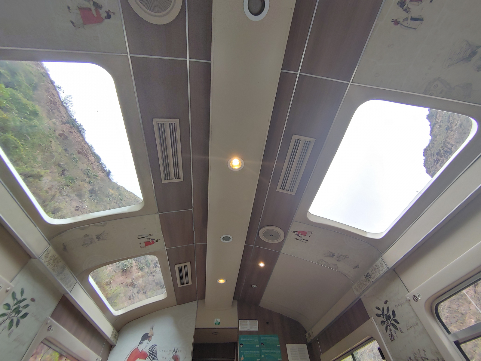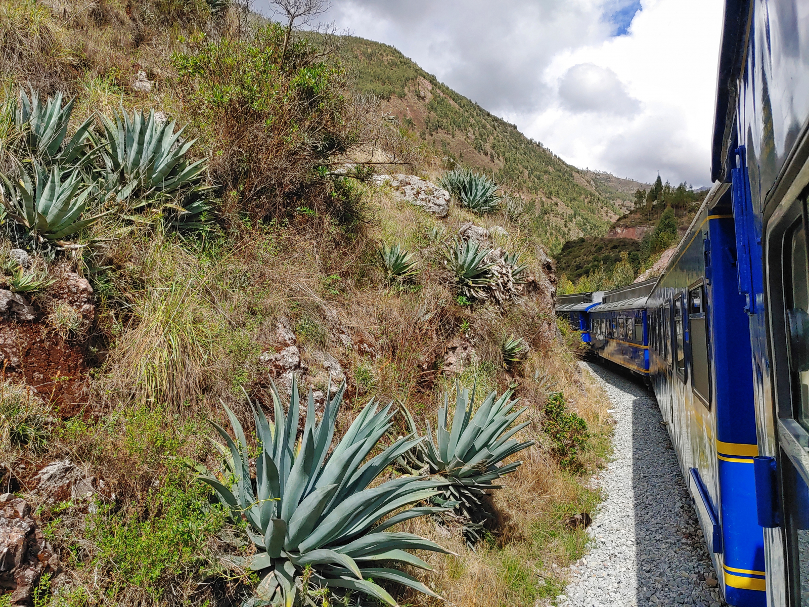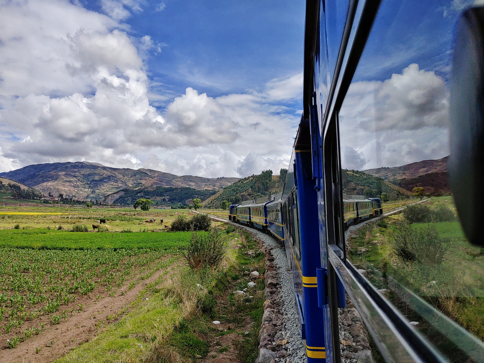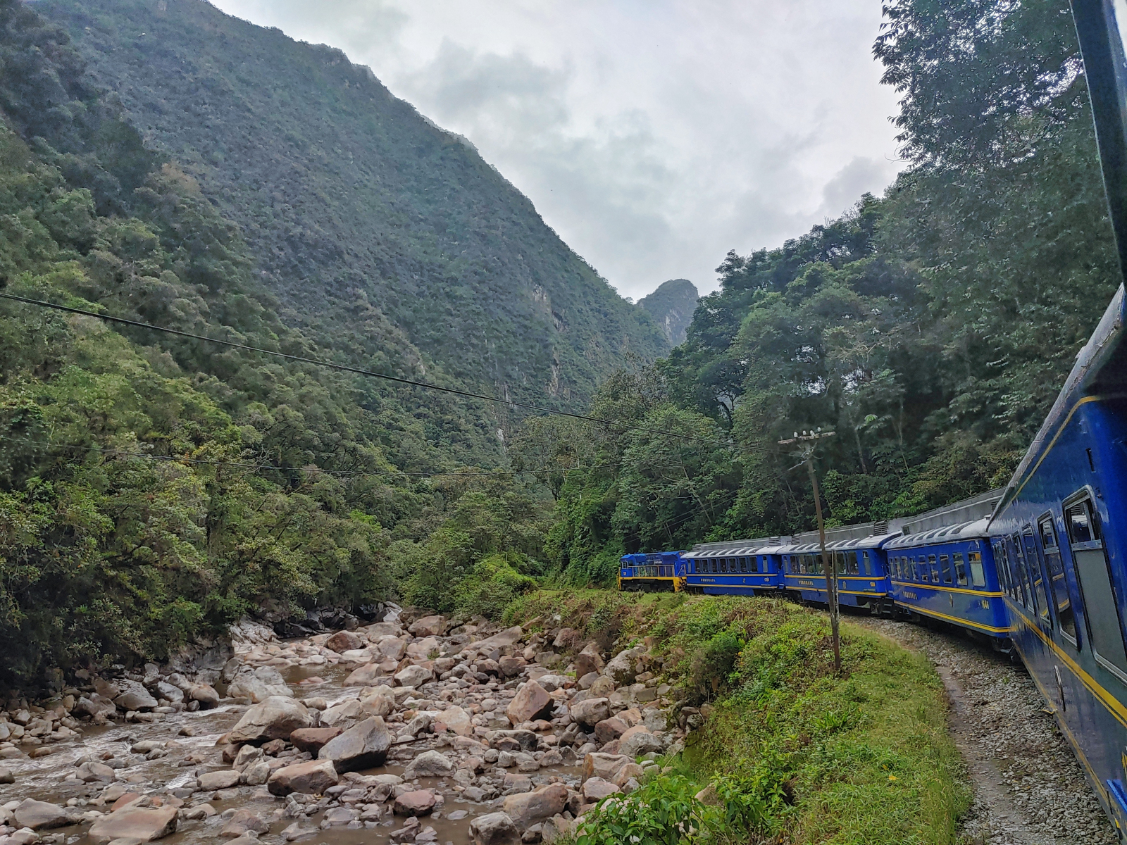 Une fois dans le train (où l’on rentre finalement sans vérification de passeports), le charme agit : la décoration un peu désuète se combine à merveille aux tacs-tacs caractéristiques des rails non-soudés (comme dans les films – si vraiment vous aimez les trains, voici une vidéo qui explique le tac-tac des trains). Par contre, si la suspension semble assez bonne, elle ne l’est pas assez pour compenser la voie visiblement peu entretenue : ça ballotte comme une brouette sur des pavés. Ça nous a beaucoup amusés mais on s’est quand même posé la question de savoir comment faisaient les gens chics, à l’aire pré-Covid, pour manger dans le train sans tout renverser dans les voitures où on servait des repas… Tout cela ne nous a pas empêchés de profiter des magnifiques paysages sur le chemin : entre les plaines cultivées de la vallée sacrée entourées de montagnes, le passage au milieu de rues fréquentées des villes traversées, les canyons encaissés où serpente la voie à côté d’une rivière (au point de voir les montagnes à la verticale de chaque côté dans les fenêtres du toit du train), jusqu’au grand Rio Urubamba entouré de végétation déjà tropicale… nous n’avons pas manqué de diversité ni de grandeur ! En plus, vu la vitesse maximale du train d’environ 35km/h, on a eu le temps de bien regarder pendant les 4h de trajet.