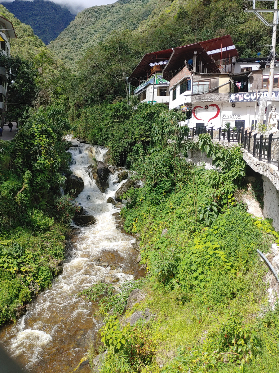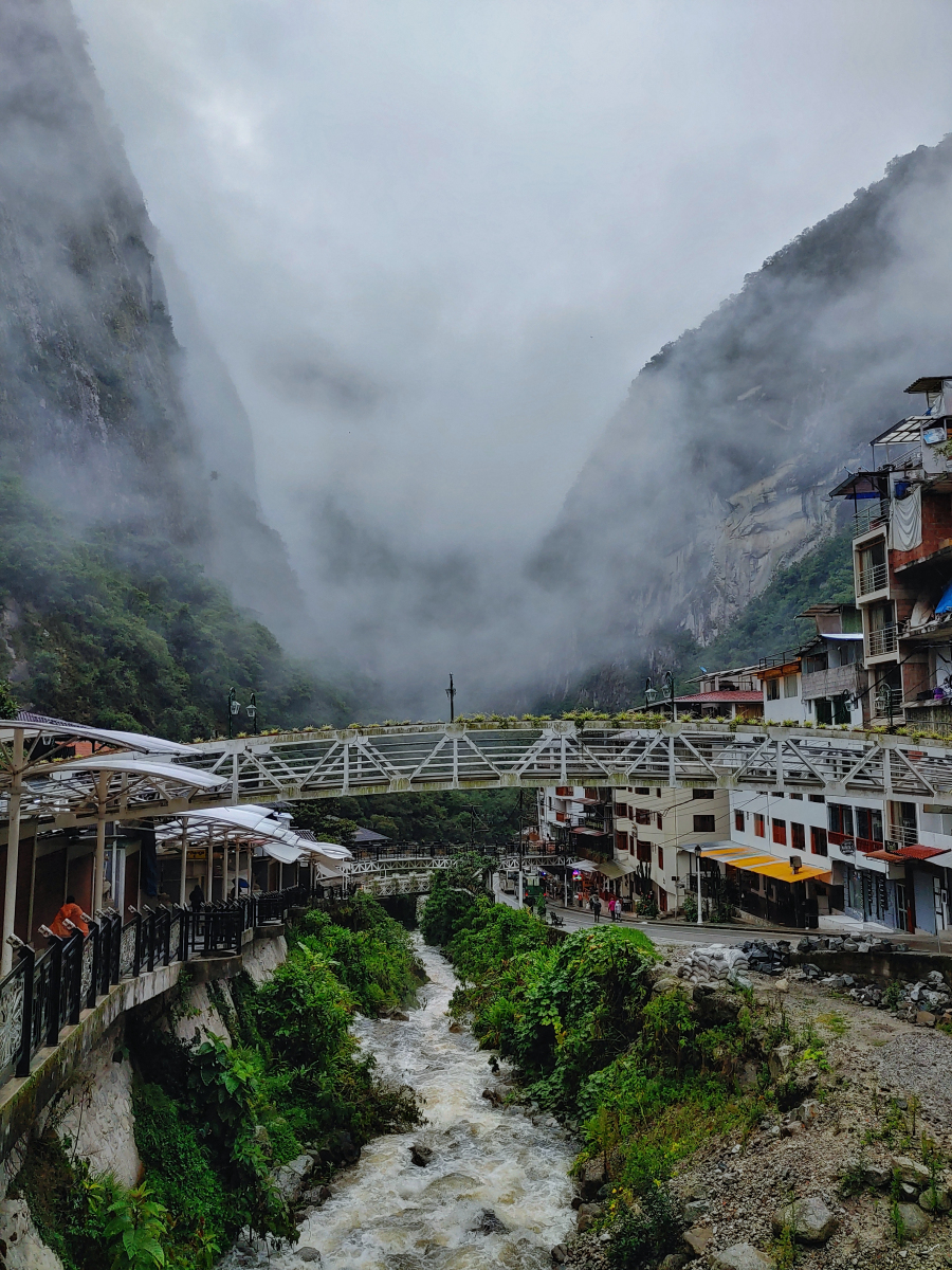 Arrivés à Machu Picchu pueblo (le village au pied du Machu Picchu), nous avons rapidement déposé nos affaires à notre hôtel d’une nuit. Et heureusement que ce n’était qu’une nuit, parce que ça ressemblait à une cellule de prison sans fenêtres – après les dépenses des tickets, on avait privilégié le prix pour cet hôtel. Mais pour 22€ la nuit, à cinq, déjeuner compris, il ne fallait pas s’attendre à mieux. Le reste de la journée fût donc consacrée à découvrir cette petite ville enclavée et escarpée, entièrement tournée vers le Machu Picchu et ses touristes, mais non dénuée de charme. Entre marchands de souvenirs, restaurants chics et chers et les ponts piétons enjambant le Rio Aguas Calientes, l’ambiance y est très agréable, surtout quand le soleil de l’après-midi chasse les brumes humides de la matinée, puisque nous sommes ici à la frontière humide entre les Andes et la Selva, la partie amazonienne du Pérou.