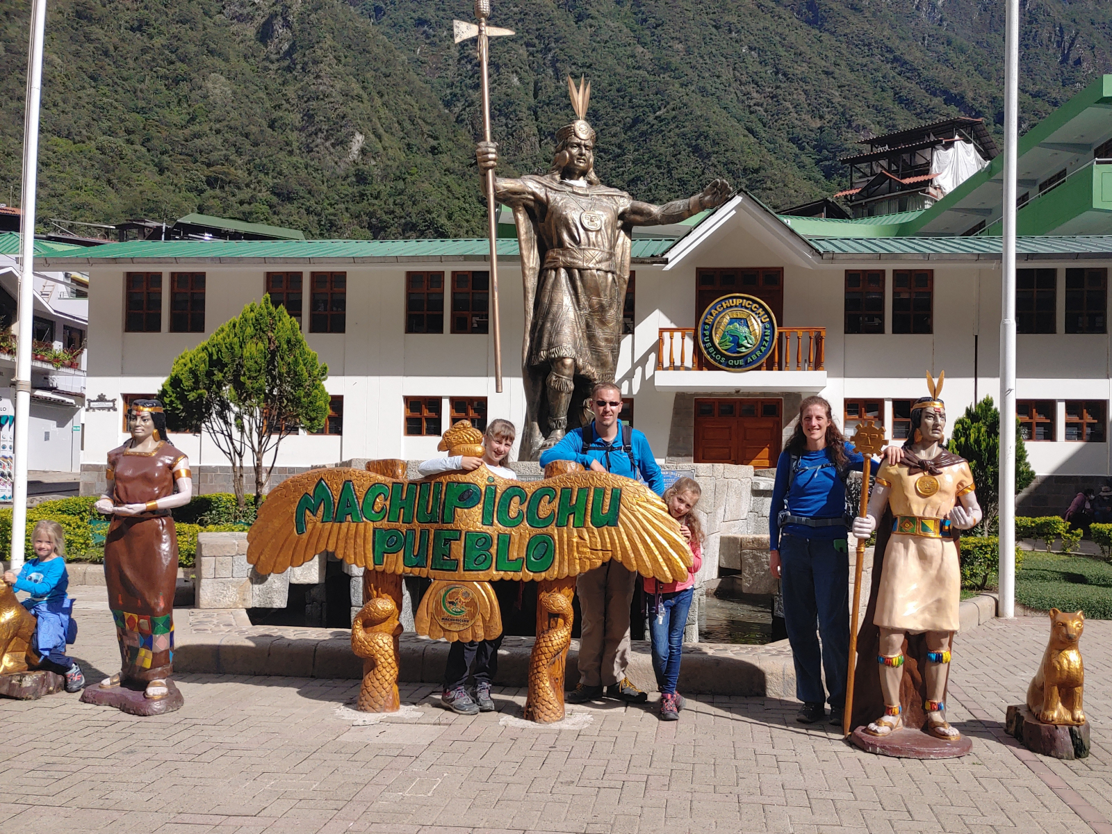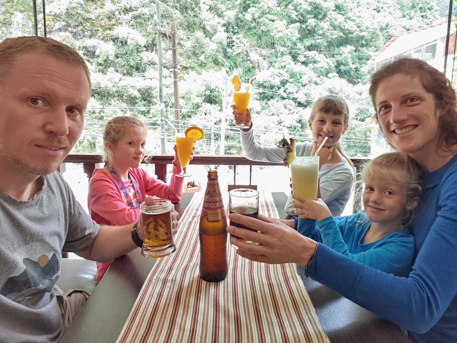 En sortant du site, nous sommes redescendus vers le Machu Picchu pueblo, visité la veille, et comme on était fatigués, qu’on avait faim et qu’on était dans un endroit touristique… nous avons profité du cadeau de nos voisins, la famille Thiry qui nous avait donné une somme d’argent avant notre départ pour un resto (encore un grand merci à eux !). Nous en avons donc bien profité sur place : un bon resto avec une belle vue. Et perso, j’y ai goûté pour la première fois de l’alpaga (très bon !). Nous avons ensuite repris le train vers Cuzco, où nous avons fait la connaissance des Géonautes (Sonia, Mathieu, Arthur et Victoria), une famille de Charente Maritime qui fait le tour du monde en 14 mois. L’occasion d’échanger des impressions et des bons plans en toute sympathie.