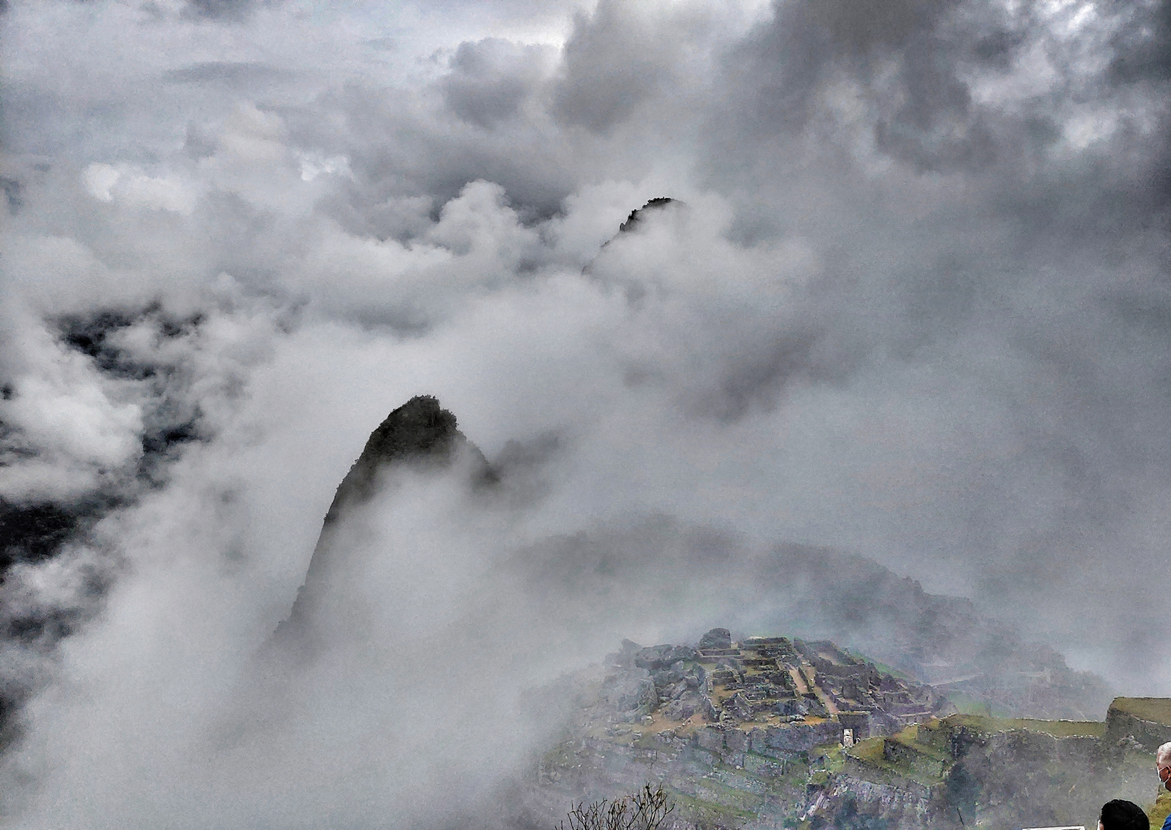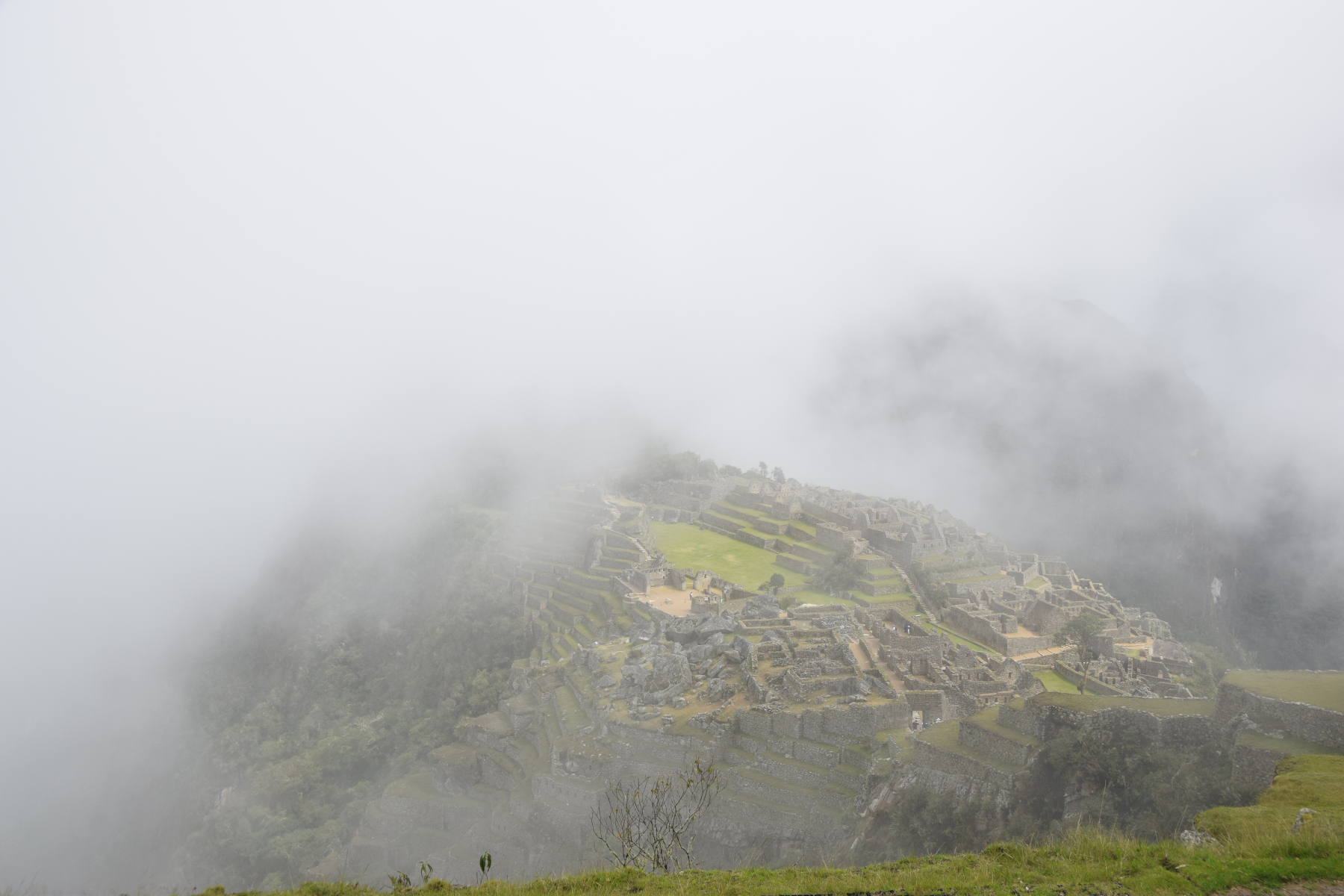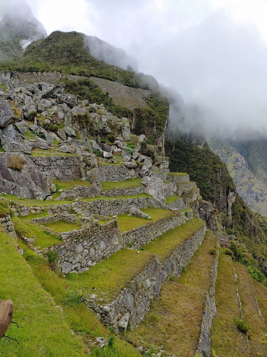 Nous avons donc attendu, pleins d’espoir, que la vue se dégage un peu. Une heure et demie, quand même. Mais nous avons été récompensés (merci Steph d’avoir insisté pour rester) car, en effet, vers 09h15, les nuages se sont levés. Assez pour voir toutes les ruines et la petite montagne derrière, mais pas assez pour voir le Wayna Picchu, la grande montagne qu’on voit toujours en arrière-plan sur les photos.