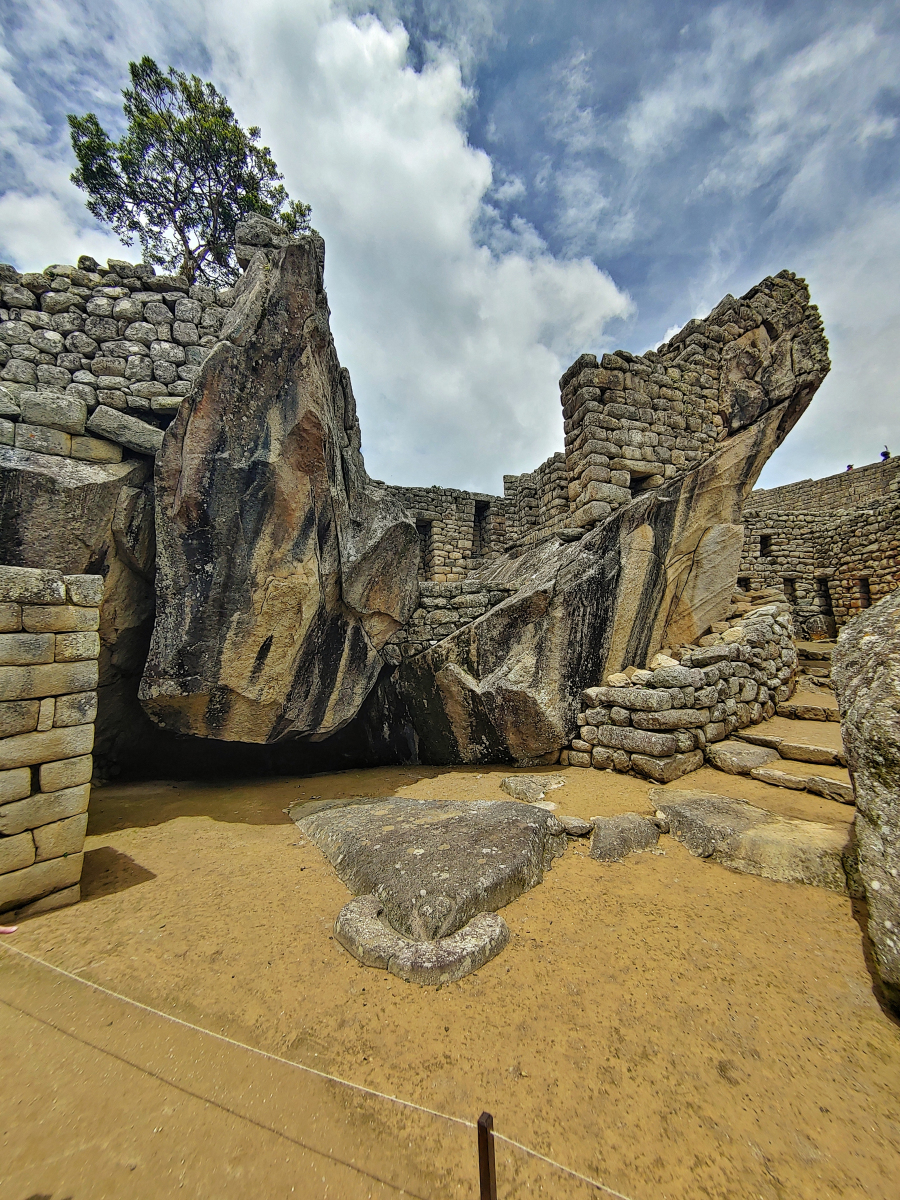 À nouveau, nous avons aussi vu la ponctualité des péruviens. Le fameux intihuatana, le « poteau d’amarrage du soleil » qui « retient le soleil » lors du solstice (il est exactement orienté vers celui-ci lors de la journée la plus courte) n’est accessible que que jusqu’à 10h. Mais à 10h pile, le gardien a méticuleusement fermé le chemin devant un groupe d’une trentaine de personnes (dont nous). Il a littéralement placé la corde de fermeture entre les gens à l’heure dite. Il aurait pu attendre quelques secondes pour éviter une frustration, mais non, l’heure c’est l’heure. Pas grave : un peu plus loin, on aura vu le temple du condor qui, lui, est ouvert de 10h à 13h 🙂