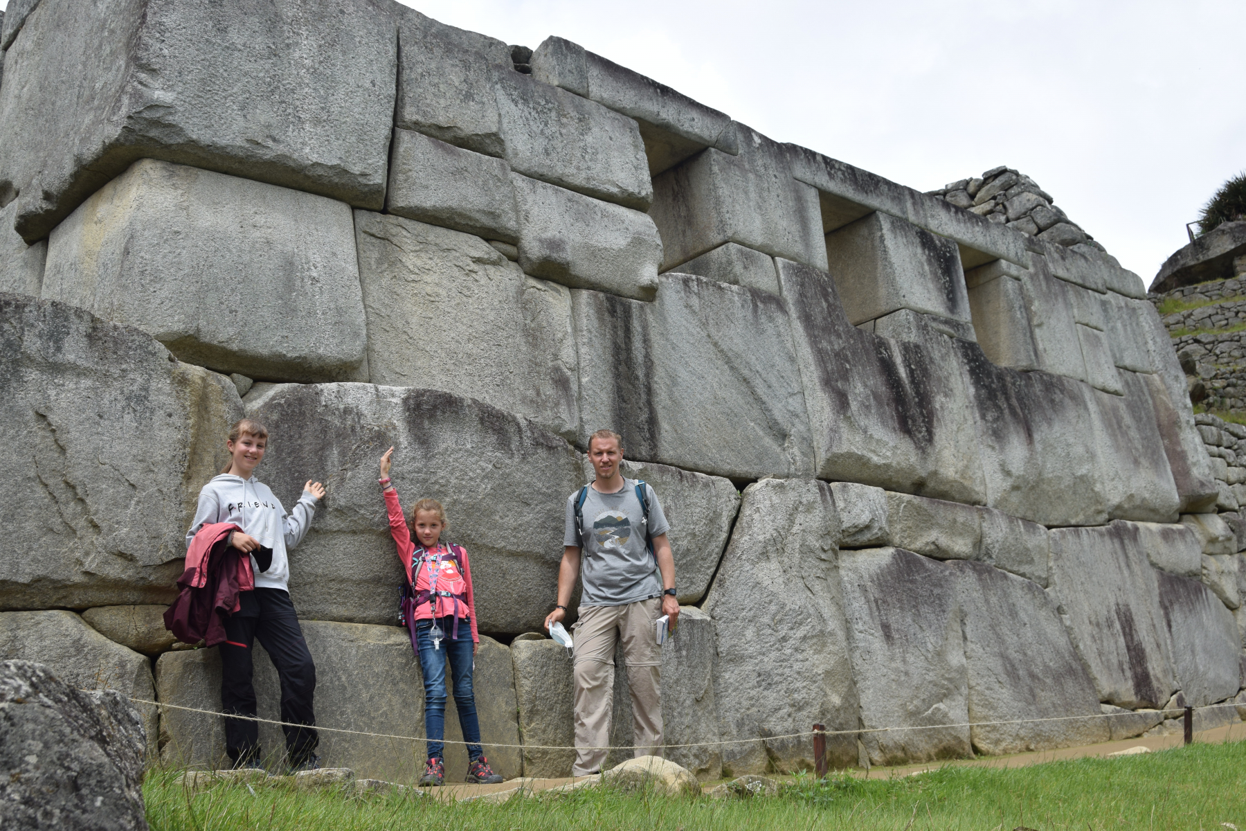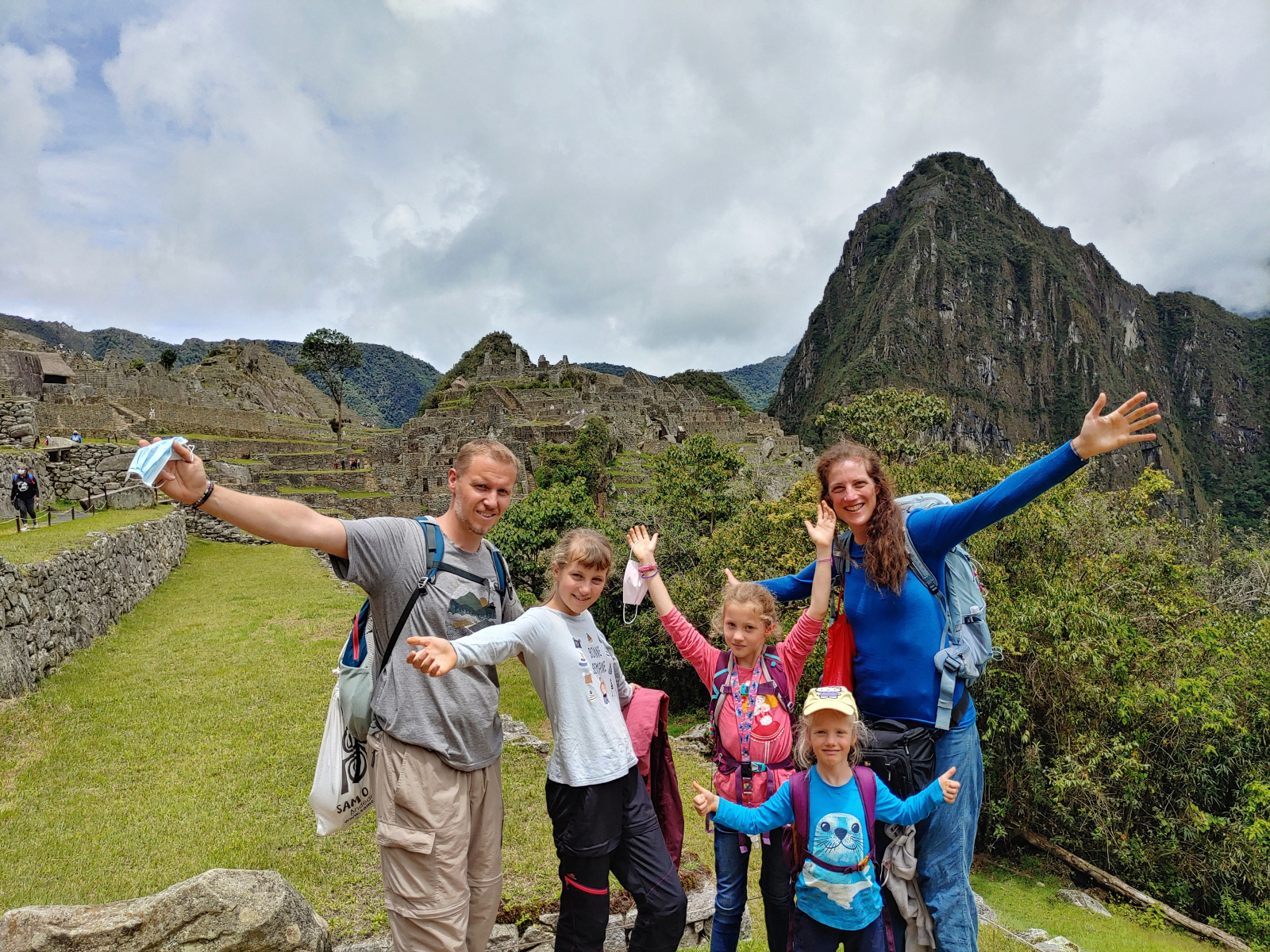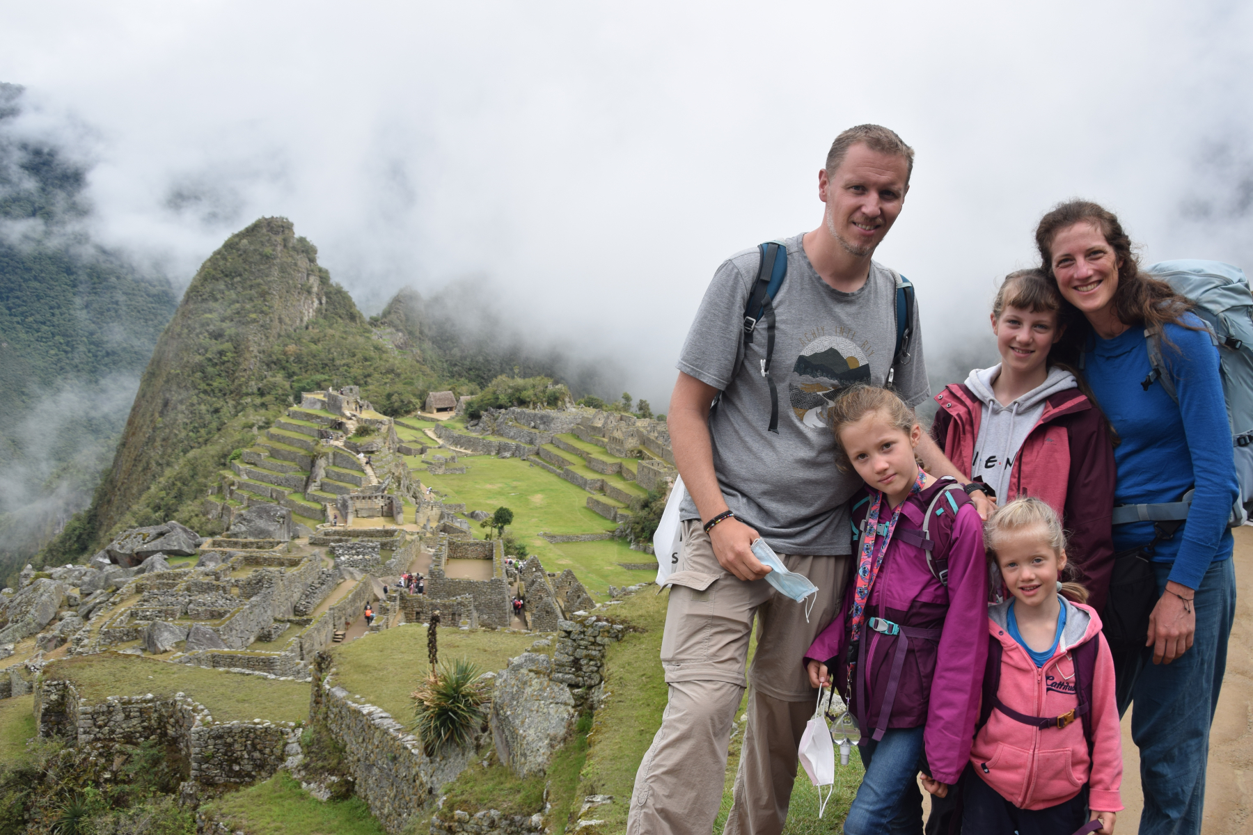 Nos tickets d’entrée étant pour 7h du matin (les entrées sont cadencées par heure pour gérer le flux de touristes et les guides conseillent d’y aller tôt le matin pour éviter la foule), il fallait se lever tôt le lendemain (« encore une fois ?! » dixit les enfants, surtout Éline). Nous embarquons dans le bus, avec nos petits déjeuners de l’hôtel empaquetés, direction le Machu Picchu après la montée serpentant à flanc de montagne. Petit stress à l’entrée quand le garde armé nous rappelle de sortir nos passeports « papier ». On lui dit qu’on les a oubliés à Cuzco et il nous répond de nous arranger avec le monsieur, dans sa cabine, qui vérifie les tickets et les passeports. Et ce dernier, au téléphone, sans un œil à nos passeports numériques, de nous laisser passer sans problème. Ouf, on est rentrés.
