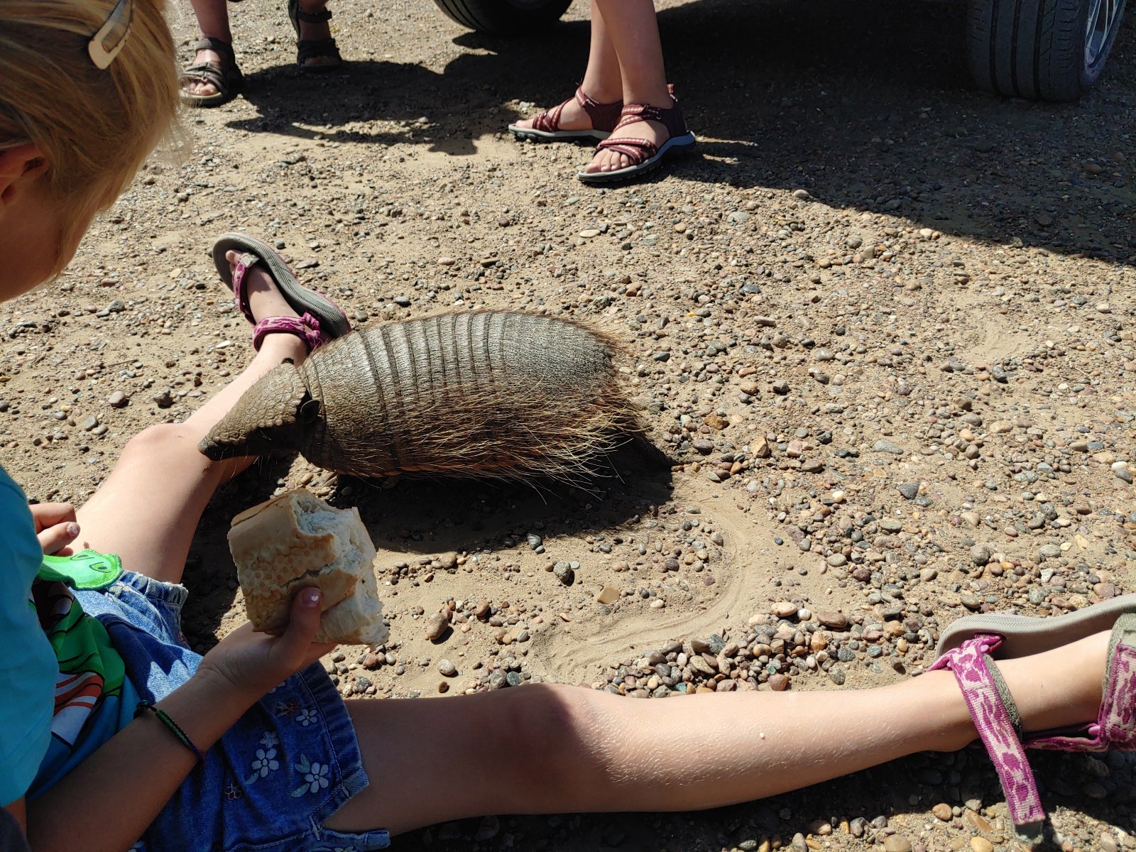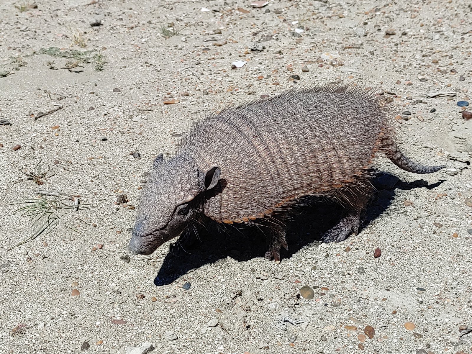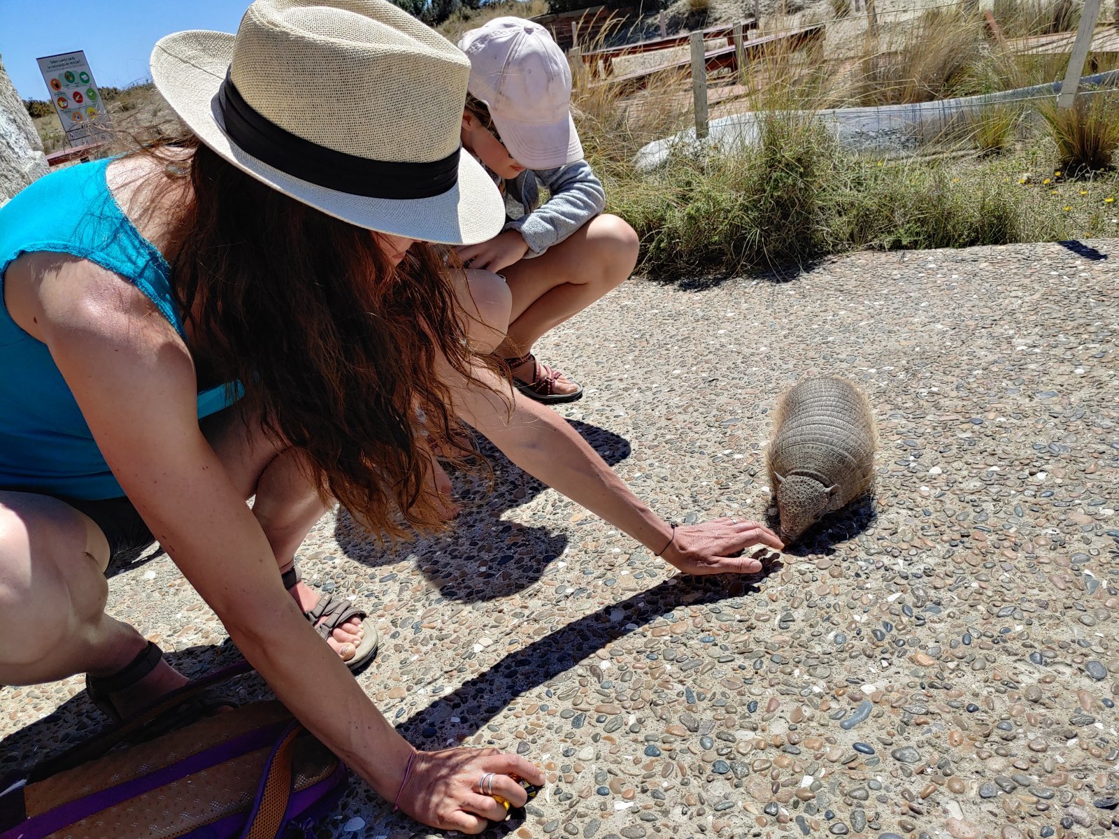 Pour observer les animaux, il y a deux points sur la péninsule (les autres étant fermés, comme j’avais mentionné). Et ils sont évidemment de l’autre côté de la péninsule. On ne peut pas faire plus loin. Près de 90 km sur une piste de gros cailloux (on reste en Patagonie !) pour atteindre Punta Norte, connue pour ses orques. Nous y sommes allés deux heures avant la marée haute, comme conseillé. Nous n’avons pas vu d’orques, mais bien leur repas : des colonies de lions de mer (les plus belles des otaries), quelques éléphants de mer (les plus gros des phoques) et un manchot, sans doute égaré. Le tout sous un soleil magnifique qui donnait des couleurs somptueuses au paysage. C’est donc bien après la marée (et l’espoir de voir des orques) que nous sommes repartis. Non sans avoir pique-niqué sur place en compagnie charmante de deux tatous qui avaient là leurs habitudes.