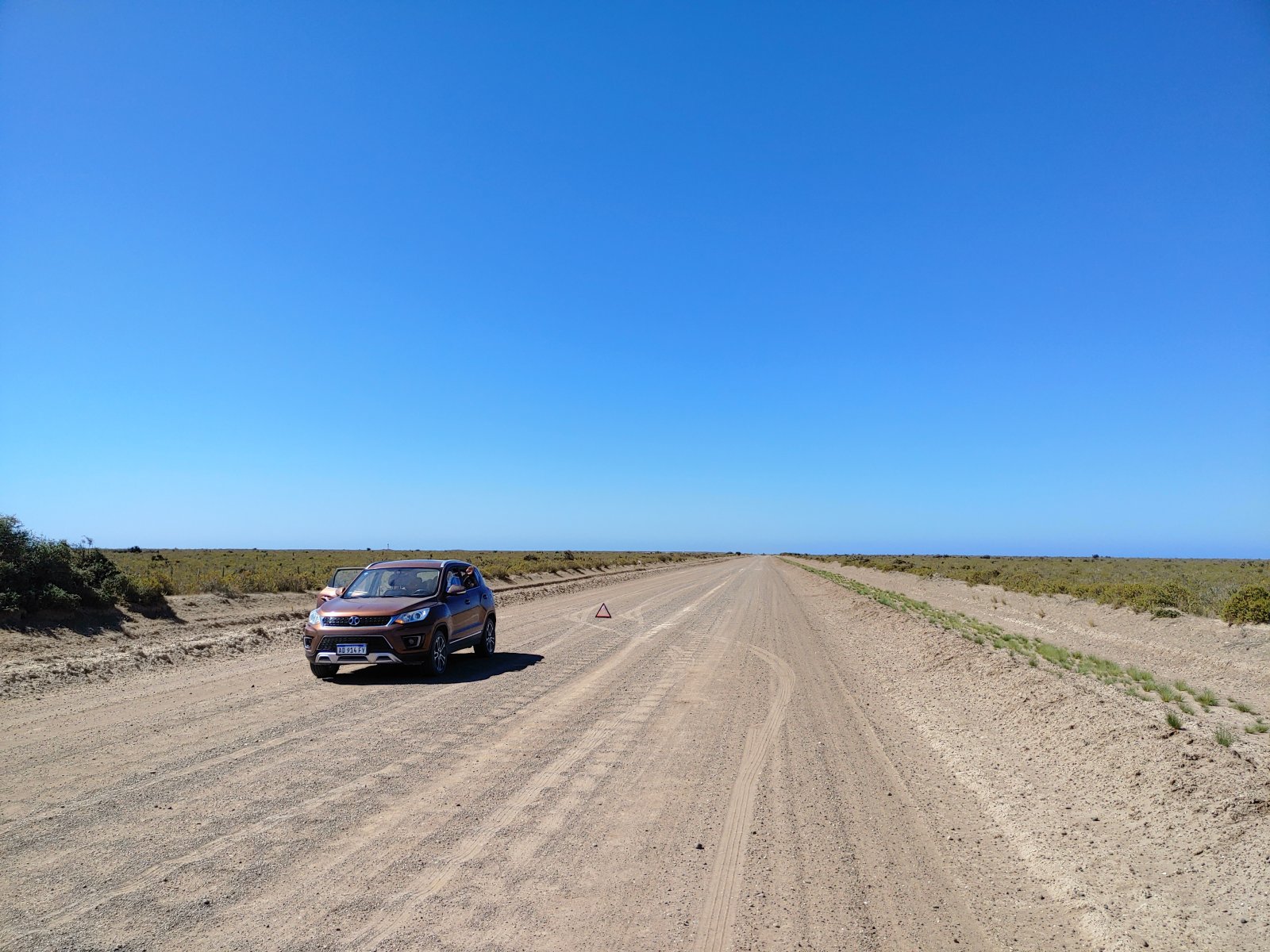 Mais dix minutes après le départ, v’la-t-y pas que la voiture s’arrête en pleine course. Plus moyen de rien faire. Panne. En plein milieu de la pampa. Sans aucun réseau. Mais rassurez-vous, il y avait du passage. Il n’a pas fallu longtemps pour que des Argentins, aussi aimables que ce qu’on a déjà pu dire, nous aident. L’un pour ramener Steph à Punta Norte afin d’appeler du secours (pendant que je restais sur place avec les enfants). Quelques autres pour nous proposer leur aide. Un autre encore pour me donner son aide presque de force et me dire qu’il va recharger ma batterie, alors que la batterie allait très bien : je roulais au moment de la panne. Après avoir placé les câbles et rechargé la batterie, mais évidemment sans aucun effet, il est parti chercher Steph. Et il est revenu, en effet, avec elle, et il nous a remorqués, avec son gros pickup, jusqu’à Punta Norte où il était plus malin de laisser la voiture.