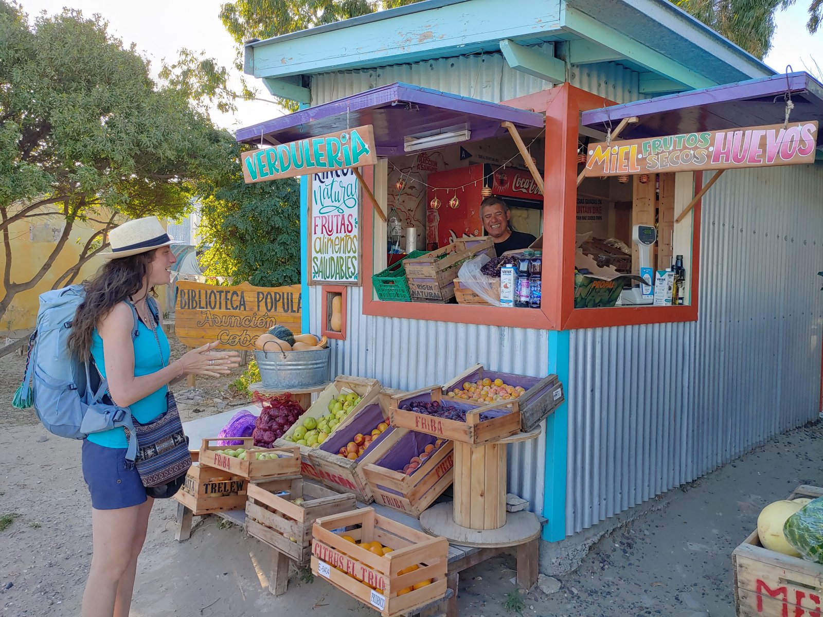 Puerto Piramides, c’est rigolo. C’est décoré avec des baleines partout (cafés, restos, tours opérateur, kioskos, école, …). Il n’y a qu’une rue, à peu près, et tout est minuscule : la police, les pompiers, l’hôpital. Ils ont probablement le plus petit magasin de fruits et légumes du monde. Et la plus petite banque. Nous logions là, dans une maison louée – sans doute la plus grande et la plus chic que nous ayons eu jusqu’à présent. Ce fût donc notre point de chute pour les cinq nuits et quatre jours sur place. À nouveau, un peu de math, deux jours de travail pour moi, un peu de plage et surtout, deux belles sorties.